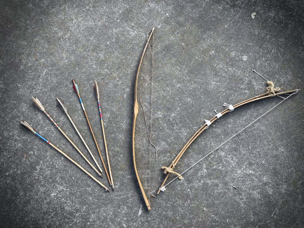「わかりやすいのが弓矢。これはヤブツバキで作った弓。この弓の強さでも、苧麻で編んだ紐なら十分弦を張れる強度がある。ナタを1本持って山に入ればこんな弓が数時間位で作れる。そしてこっちは俺が先住民技術の学校で習った『親子の弓』の日本版。2枚の竹を合わせた強化弓。これは竹を割って2本裏表で貼り合わせていてそれを紐でくくってあるだけ。これなら紐さえあれば1時間かからない」