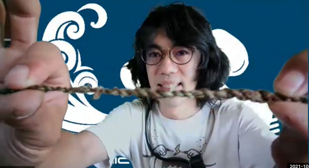 「今回の講座を用意しながら至った結論が『ロープとは文明そのもの』であるということ。自然繊維は有限の長さを持っているけれど、編むことで無限の長さ、無限の太さ、無限の強さに変えていける。そこから武器も作れるし、衣服も作れるし、住居にも発展するし、断熱材にもなるし、緩衝材にもなるし、すごい色んな所に広がっていく。だから紐を作るのは文明そのものだと思います」