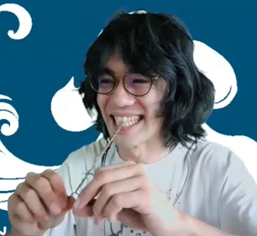 「噛みます。クルンを噛んで下さい。そして、さらに撚りをかけていきますが、撚ってた方向は今までと一緒にしてください。つまり、左右の手に持つ繊維を両方指で同じ方向に撚りながら、指でかける撚りとは反対の向きに全体を回転させる。さっき手のなかでやった縄綯いと同じことを口と手を使ってやる感じ」