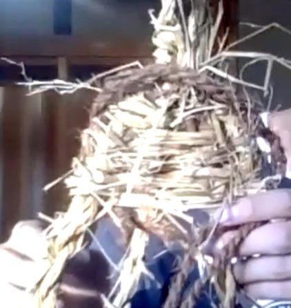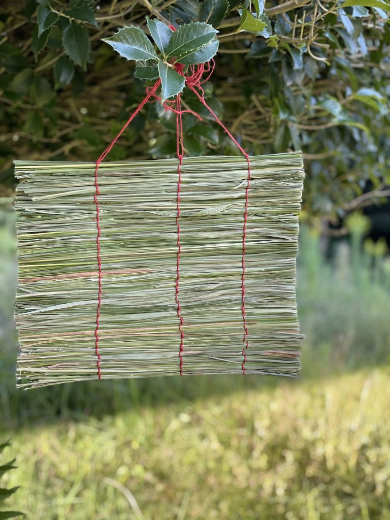 「筵(むしろ)の薄いのが薦(こも)。冬に樹木に巻いたりする。薦巻きのこも。見ての通りカヤをちょっとずつ紐で縛っているだけ。俺が使った薦編み機は段ボール箱に切れ目を3つ入れただけ。ここに紐渡して、コマっていう重石を紐につけて編んでいく」