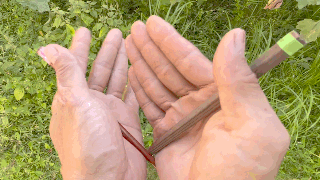 テンダーさんは紐を使ったさまざまな猟具を紹介していきます。石を高速で遠くへ放つスリング。紐の両端に石を繋ぎ、獲物に当たると絡めとるボーラ。木をたわめて、その反発力でトリガーを踏んだ動物の足をくくるローリングスネア。