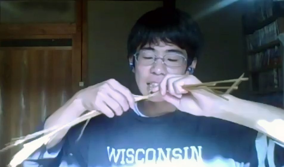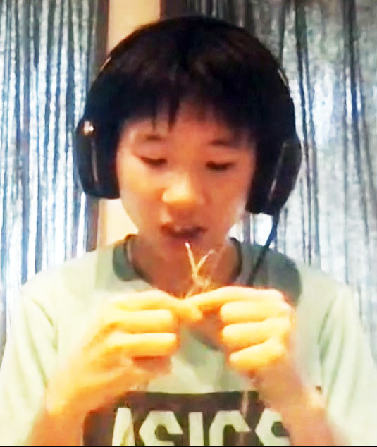 「こんな動きで植物の繊維を縄に変えていきますが、いきなり草からは難しいので、まずは練習。みなさん、色の違う2本の箸は用意できているでしょうか?