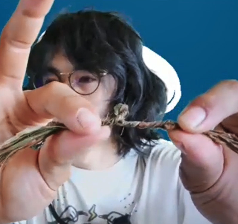「縄をつくる方法としてもうひとつ『コーデージ』をご紹介します。これは北米先住民に伝わる技術。苧麻のほうがやりやすいけど、カヤの人はカヤでもいいです。カヤの人は葉を割いて細くして、その繊維を束ねて使ってください。コーデージは細い紐をつくるのに向いた方法です。罠とかアクセサリーとか、小さい物に使う紐をつくる技術です。