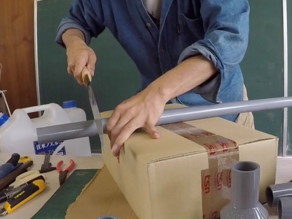 塩ビ管の秘密を知ったら、いよいよ実作業へ。ノコギリで塩ビ管を切り、切り口のバリを取ってつないでいきます。