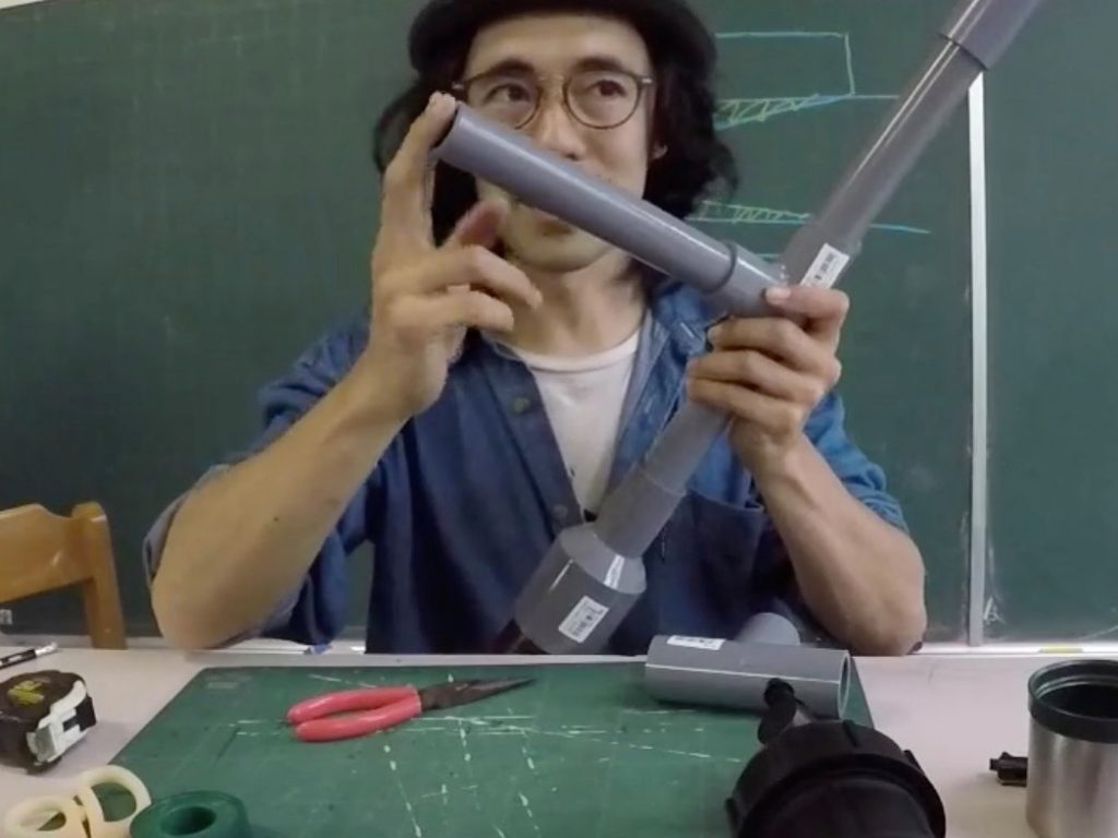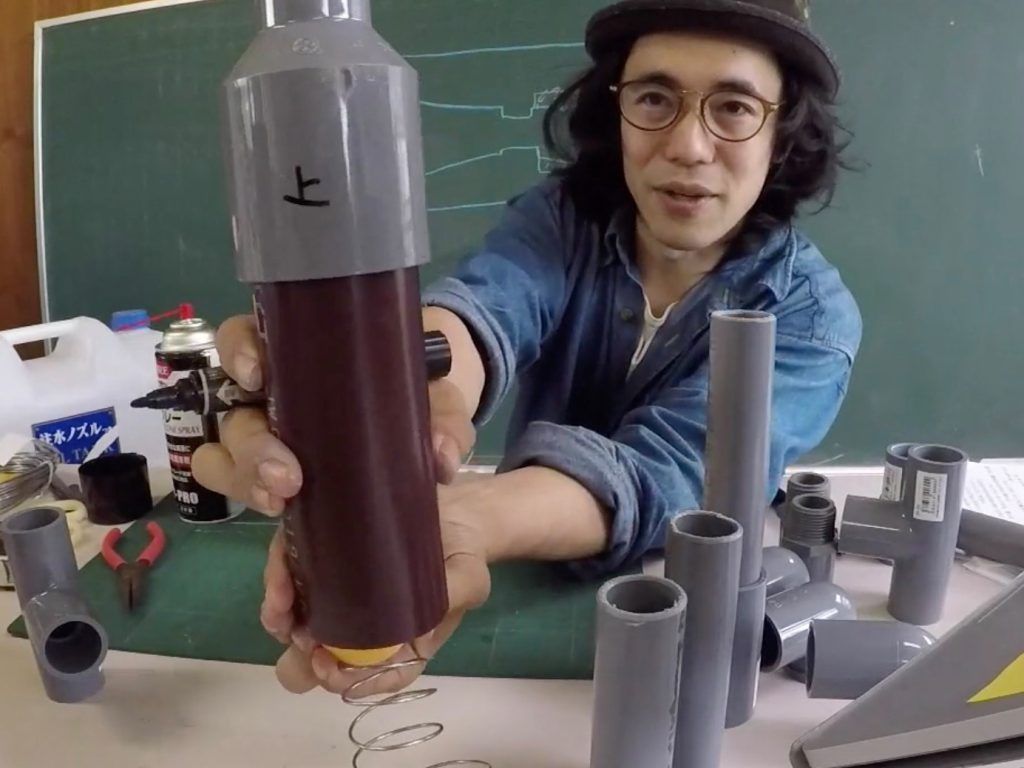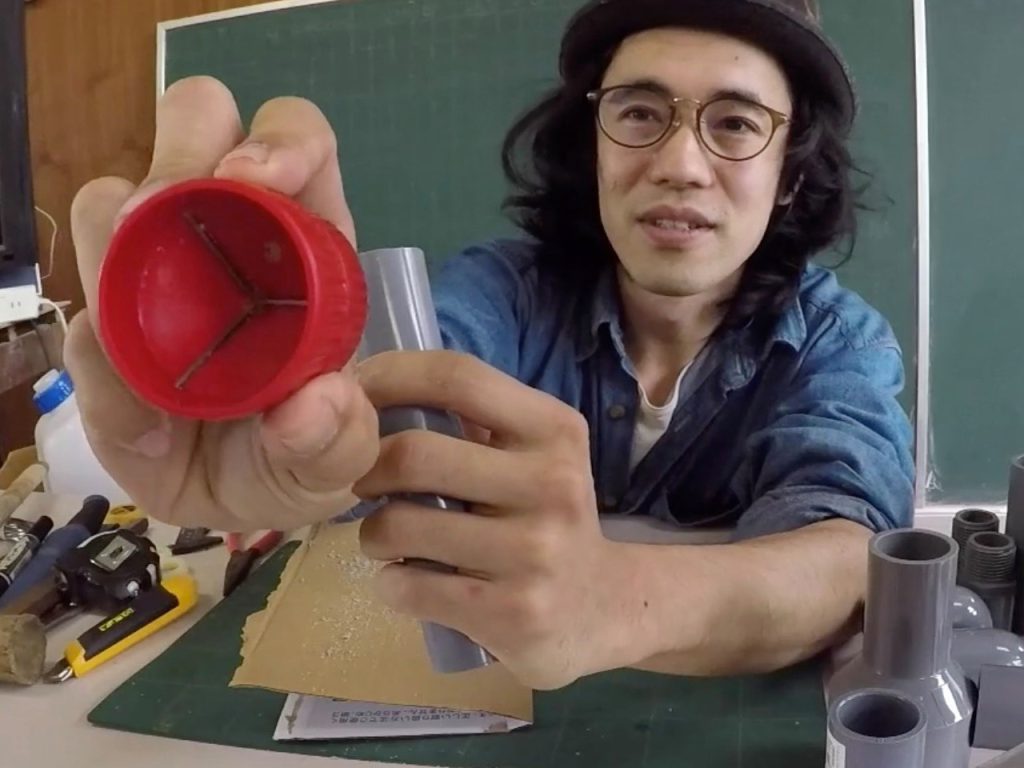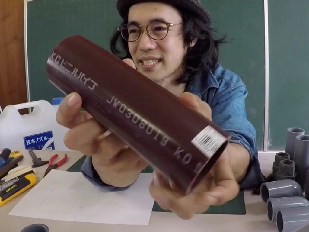 「普通はネチョネチョの塩ビ管用接着剤で固定するんだけど、それには有機溶剤っていう体に悪いものが入っていて、塗ったらすぐにギュッて入れないと固まっちゃう。そこで今日お届けするのは、俺が発明したスペシャルな塩ビ管の接合方法です。
