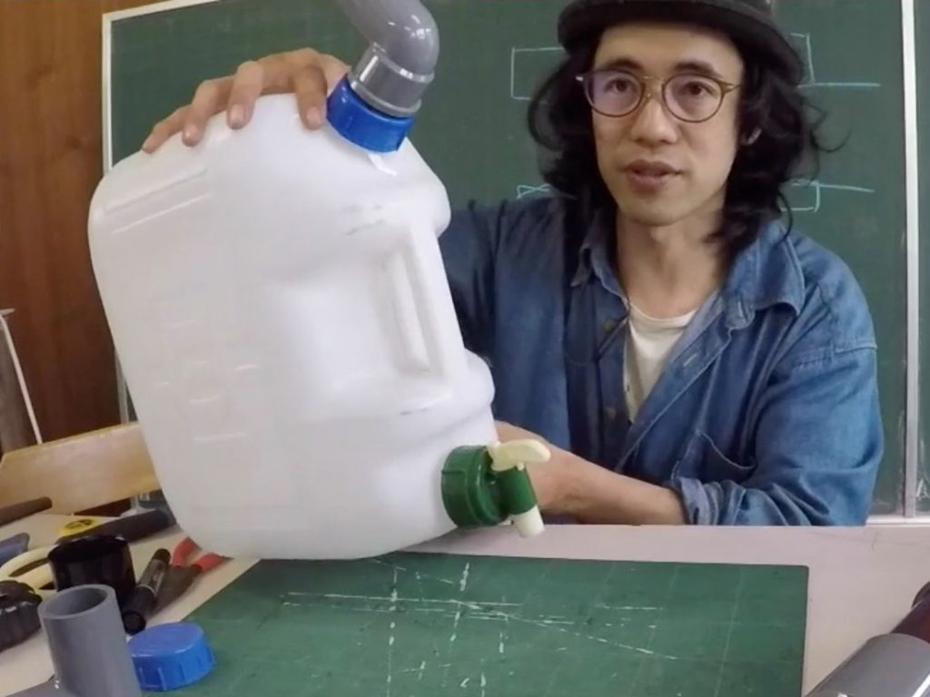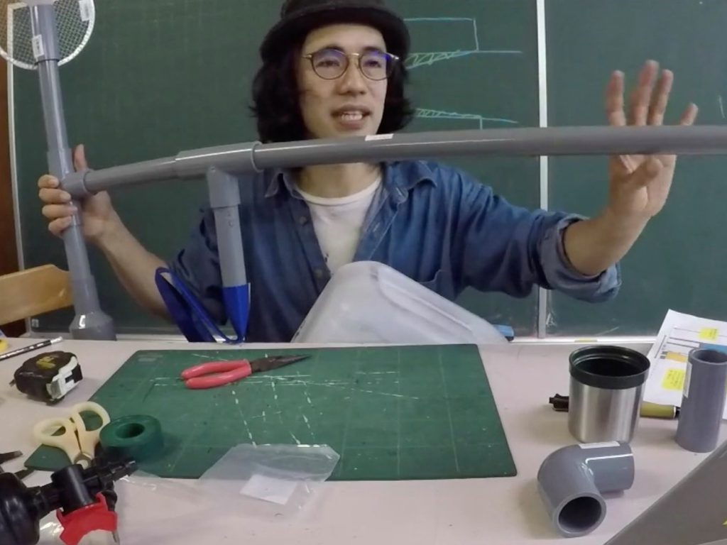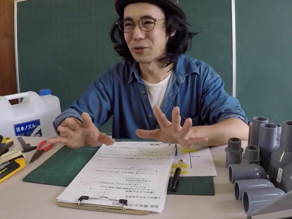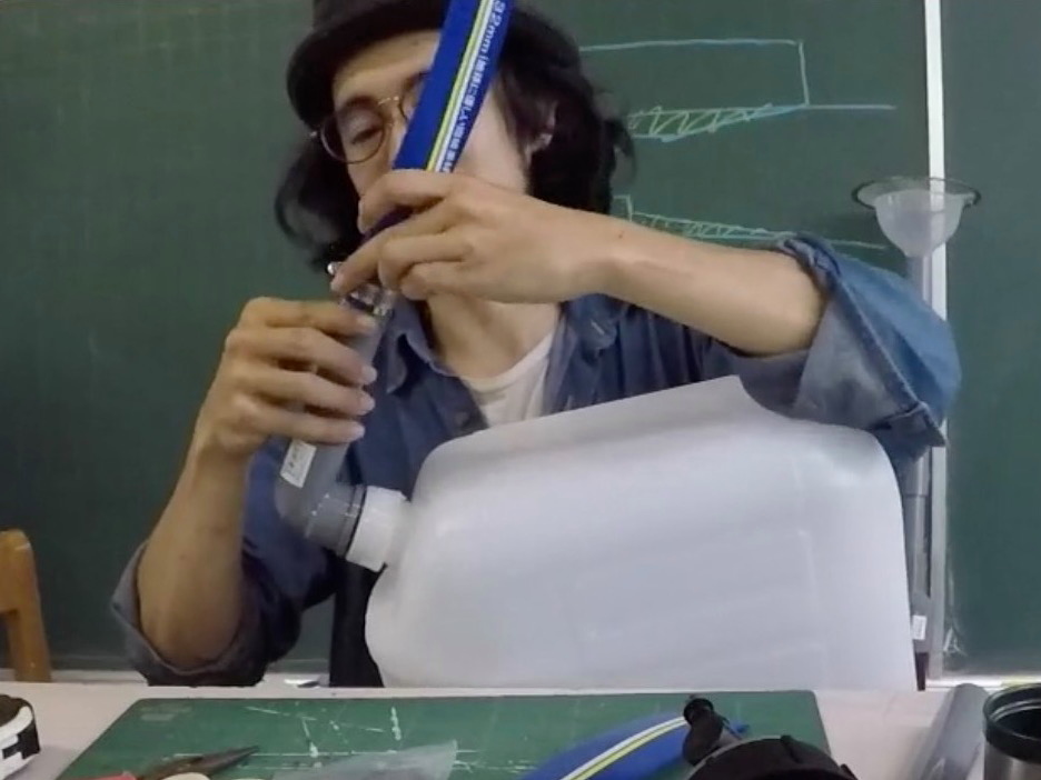 「今から作るのがこの雨水システムの一番重要なところ。ファーストフラッシュするためのフロートバルブです。それではみなさんご唱和ください。ファーストフラッシュ!」