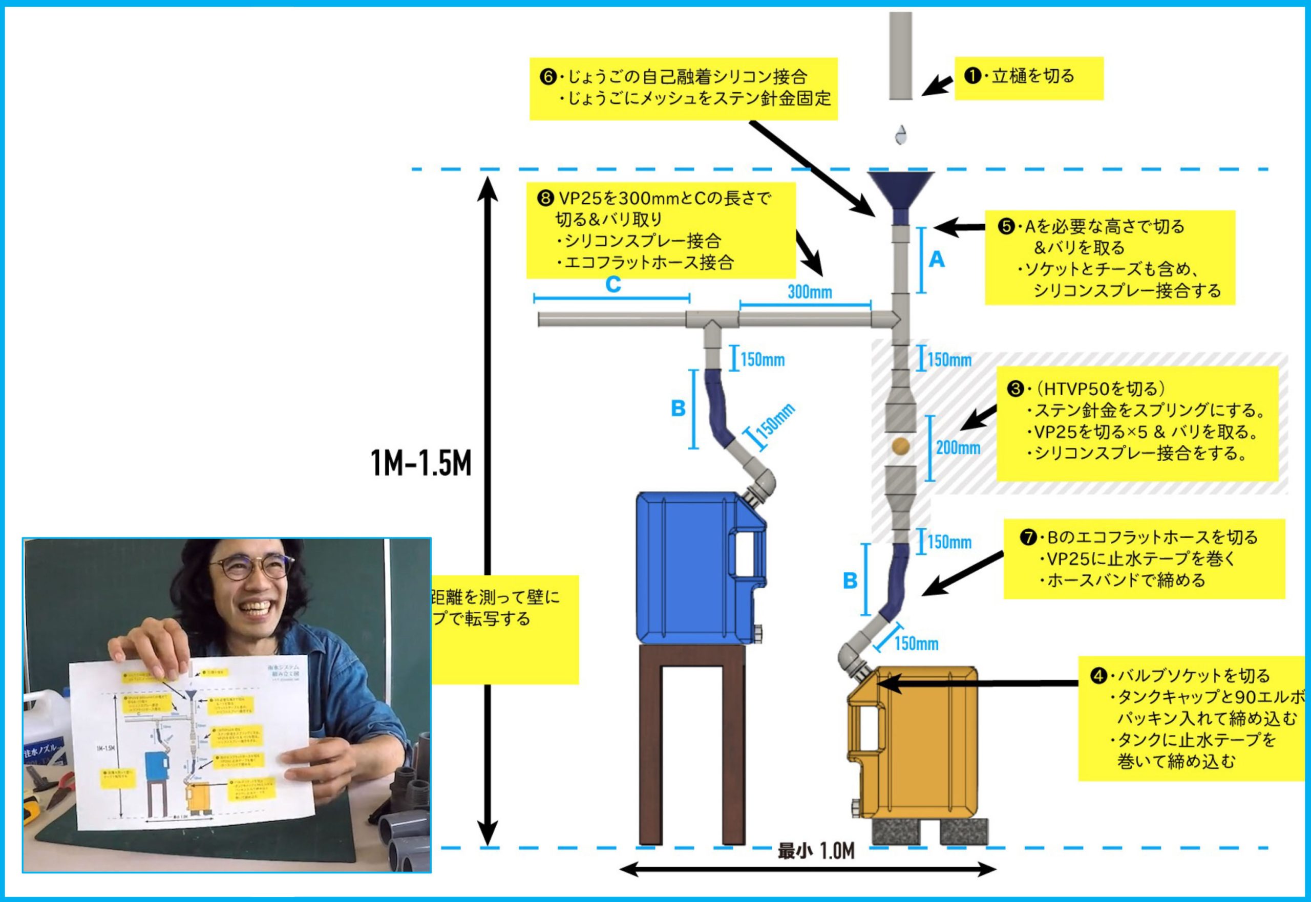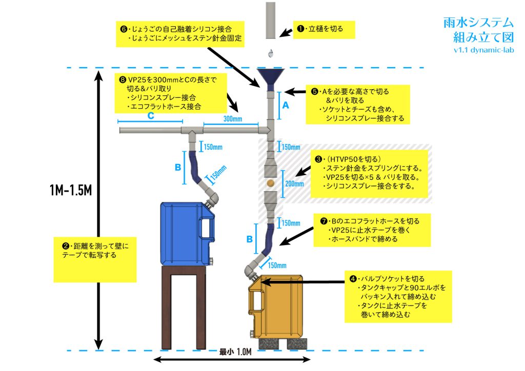 「良かった! 先に出した指示では『縦樋を切っておく』と書いたんだけど、全体のシステムができてから切ってもいいなと思い直していたので。それでは、ご自宅の縦樋とそれを切る位置を心の中に思い浮かべてください。それを想像しつつ見てほしいのがこの組み立て図。システム全体は横幅が1mぐらい、奥行きがたぶん30~40㎝、高さが最大1.5mぐらいになります。目的の場所には置けそうでしょうか? 実際にどう納まるかは、組み立ててみないとわからないので、とりあえず今はそれなりの大きさになるぞと覚えていてください」