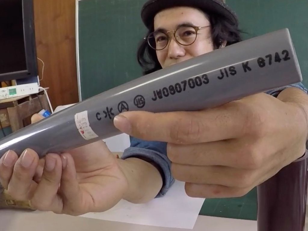 「それでは、HTではない飲み水用のパイプを見てみましょう。このVP25をよく見ると『JIS K 6742』って書いてありますよね。『JIS』とは日本の商業的に作られる物の規格で、『K 6742』っていうのは塩ビ管の区分なのね。そして今日使う6742はここに「*」って書いてあるじゃん。これ、漢字の『水』なんだよ! 模様じゃなくて。