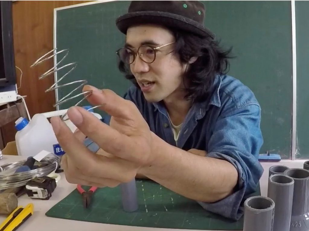 「ファーストフラッシュは自動弁で行ないます。ピンポン球を硬質塩ビ管に入れてその上下を異径TSソケットではさみこむ。これをシステムにつなぐと硬質塩ビ管のなかでピンポン球が上下して弁になります。異径TSソケットの内径よりもピンポン球のほうが大きいから、ピンポン球は流れ出ません。だけど、ピンポン球をそのまま入れると、水流に押されて下側の異径TSソケットを塞ぐことがある。塞ぎたいのは下側ではなく上側だから、ピンポン球が下側の異径TSソケットを塞がないようにスペーサー*を作りたい。そこで使うのが針金です。お手元のVP25に針金を6周巻いてください、大体でいいし、歪んでも構わない、これには精密さはいらないです」