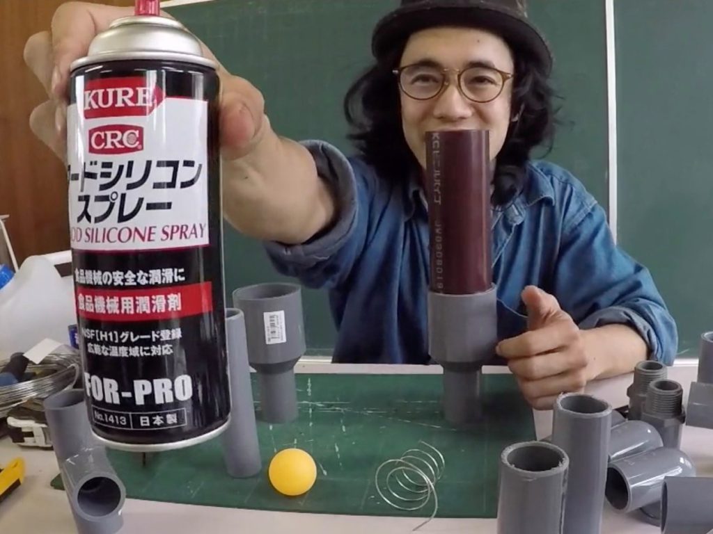 皆さんお手元にフードグレードシリコンスプレーをご用意ください。これは食品を製造する工場で使われる潤滑剤で、食べ物に入ってもまあまあ許容できる、といったスプレー。皆さん試しに、どこかにひと吹きしてみて。メチャメチャ滑るから。シリコンスプレーは開けづらい障子とか夫婦仲とか、うまく動かないものの潤滑をしてくれます」