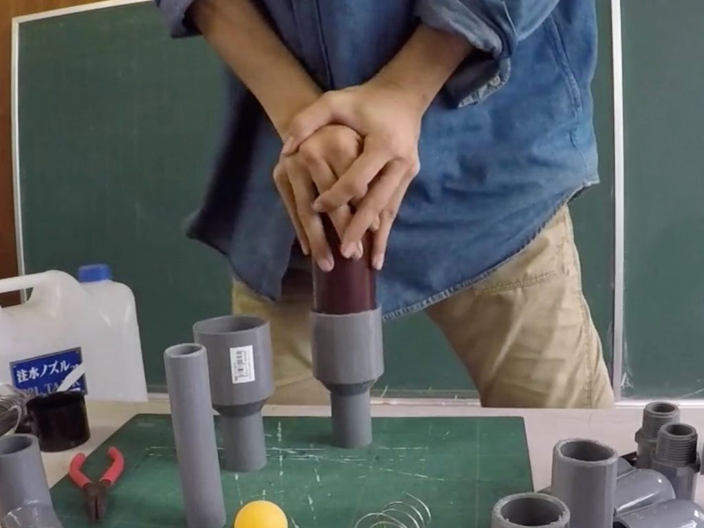 針金が作れたらピンポン球とともに硬質塩ビ管に入れ、上下から異径TSソケットではさみこみます。ここで新たな秘密道具が登場しました。