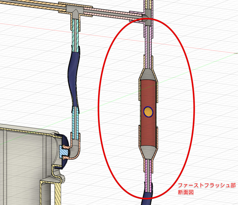 「針金を巻いたら1段目だけグワッて広げて、硬質塩ビ管に入れる、こうすれば針金がスペーサーになって、ピンポン球が下側のパイプを塞ぐことがない。でも、下のタンクに水が溜まったときには浮き上がって上側のパイプは塞げる。下のタンクのバルブを開けて水をジャーって流したら、ピンポン玉もストンと落ちてファーストフラッシュ機構もリセットされる。そんな仕組みです」