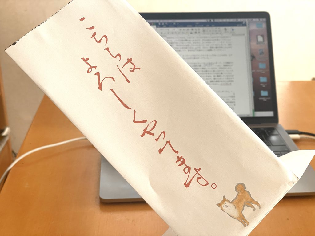 「これは秘密兵器の『こちらはよろしくやってます。』ボード。今日はみなさんがご家庭から参加しているので、子供が泣いたり、隣家の犬が家に入ってきたり、庭のビワをお隣さんに食べられたり、といったことがあるかもしれません。そんなときはこれをカメラの前に置いてください。そうすると技術的なトラブルが起きているのか、単に離席しているのかがこちらにわかる。今日の講座は録画をしているので、後からゆっくり自分のペースで再生できます。だから、疲れちゃったり、諸般の事情がある人は無理をしないで『よろしくやってます。』ボードを掲げてください。ようござんすか?」