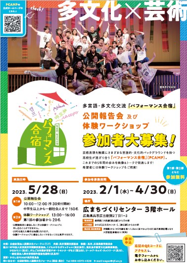 「多文化×芸術」をコンセプトとする多言語・多文化交流「パフォーマンス合宿」(PCAMP)は、公益財団法人国際文化フォーラム(TJF)設立30周年記念事業として2017年度にスタートしました。これまでの5年間、全国対象対面型(東京会場)、国内外対象オンライン型(ZoomやVR上)、地域密着型(ひろしまPCAMP)へと進化しながら進めてきました。これから新たな展開をめざすにあたり、公開報告会及び体験ワークショップを実施します。