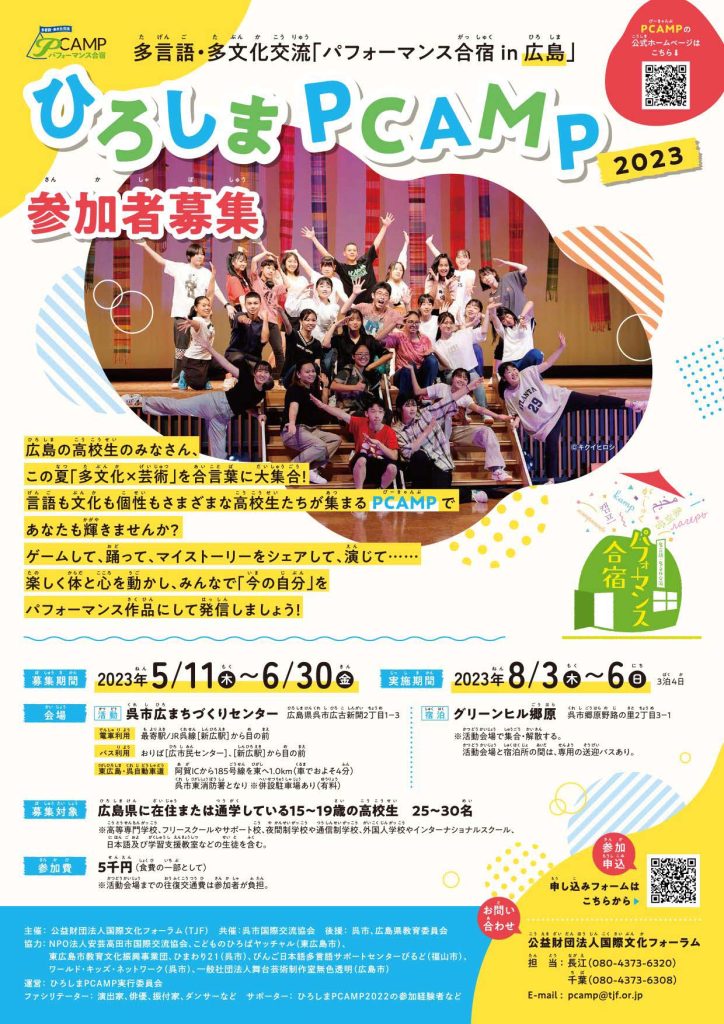 今年の「ひろしまPCAMP2023」も充実したプログラムになるよう準備を進めています。みなさまの周りのダンスが好き、演劇が好き、人見知りだけどやってみたい、いろいろな文化に触れてみたい、高校生最後の夏の思い出にしたい…といった15~19歳の方々に是非このプログラムをご紹介いただきたいと思います。