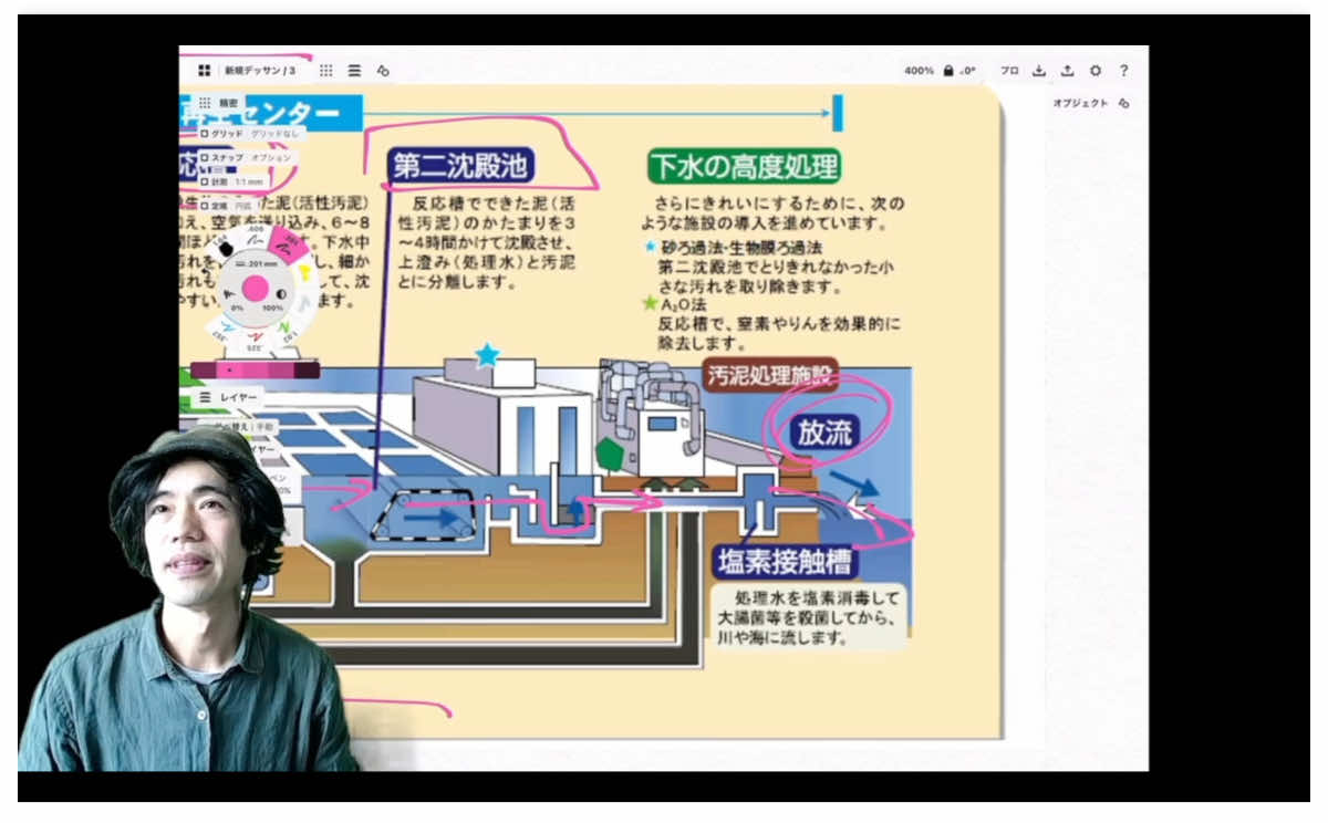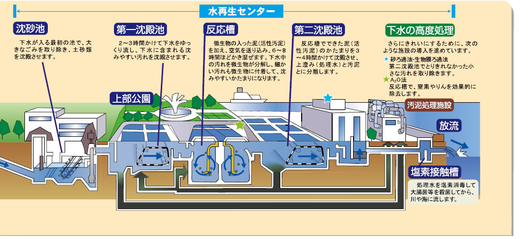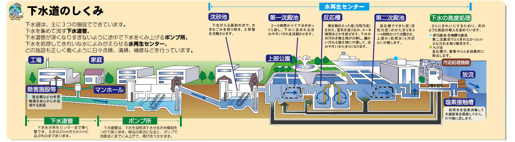 その後はまた沈殿させたのち、下水処理場によってそれぞれで、逆浸透膜っていうすごい目の細かいメッシュを通して色んなものを濾し取ろうとか、何か化学反応させようとか、いろんなやり方で水をきれいにして放流しましょう、となっております。