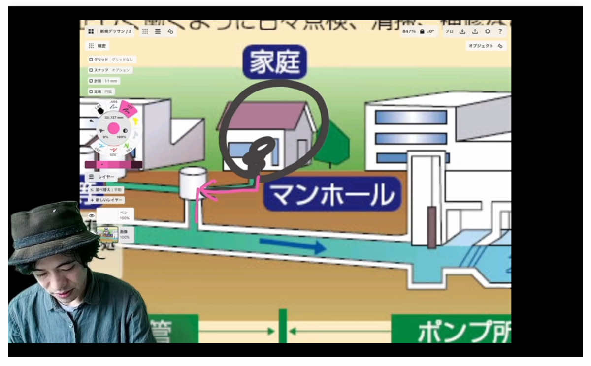 お家があります、トイレがあります、トイレから下水に繋がっていって、下水道管に入ります。まずは図の左側の部分ですね。