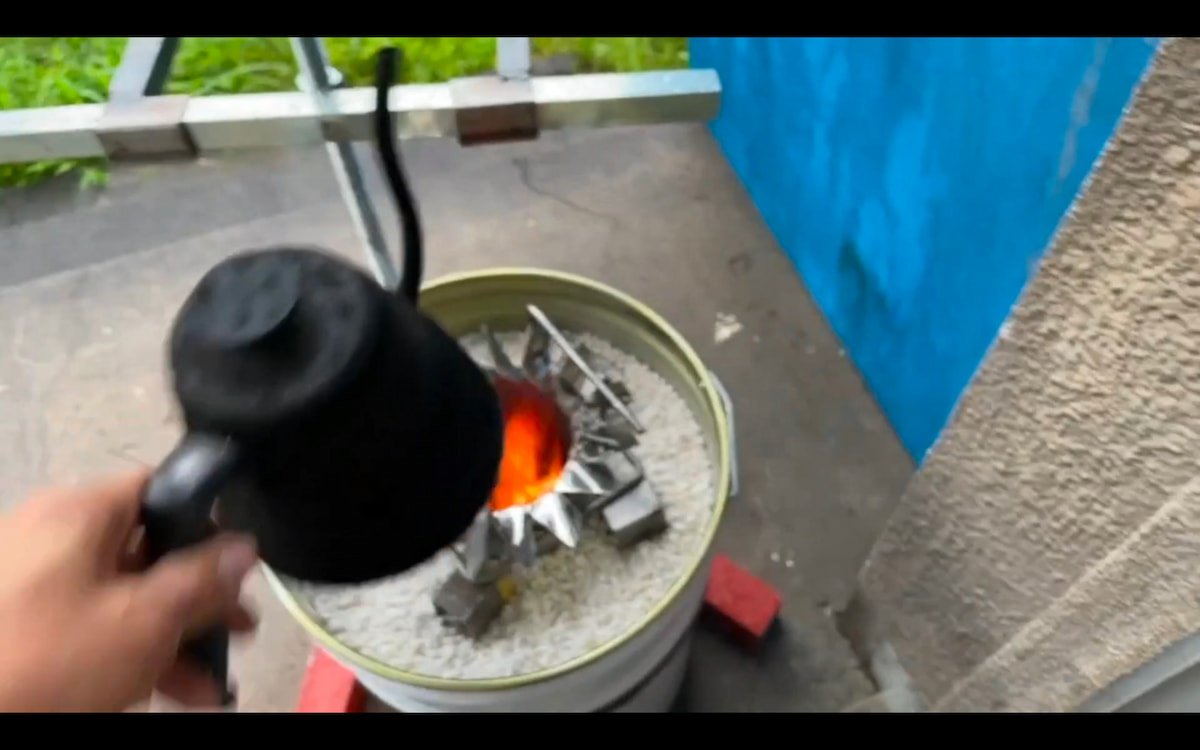 まず、火熾ストーブではビクナイザーは全体が真っ赤に赤熱します。これはビクナイザーの温度が800度近辺まで上昇していることを意味し、炉内でアルミを溶かすこともできます。