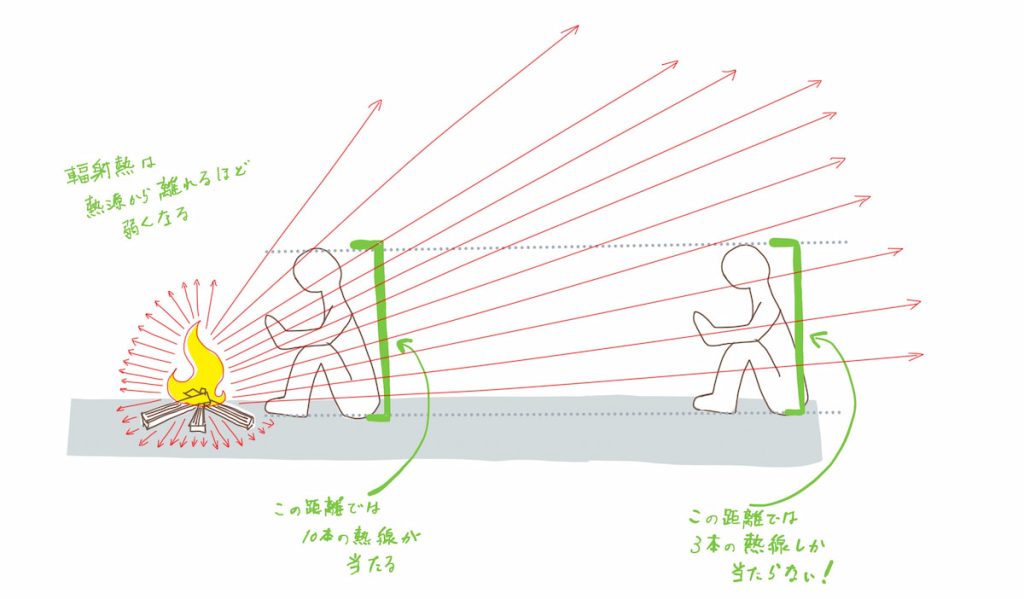 これは、焚き火の発してるエネルギーが100だとして、そのエネルギーは「焚き火(熱源)のそばにいた方が圧倒的に多く受け取れるから」です。