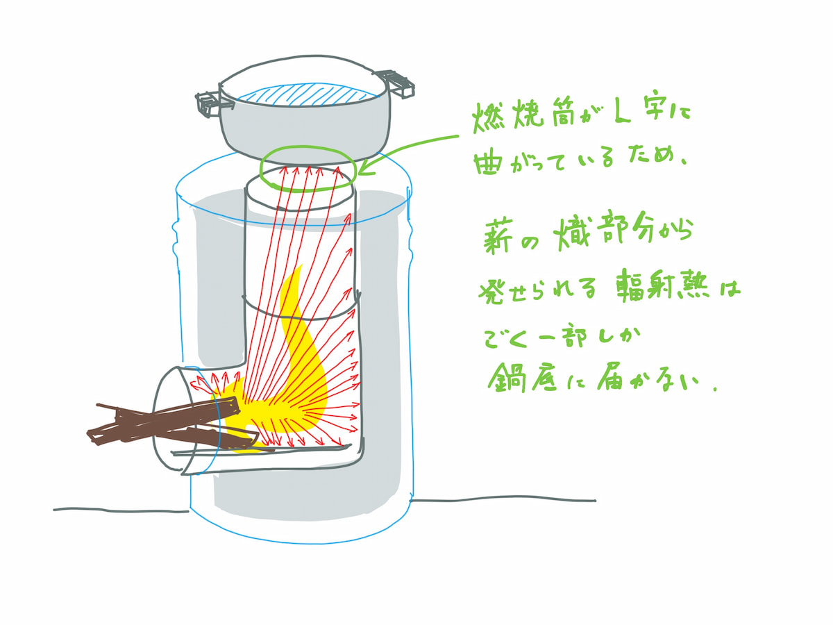 かたや、ロケットストーブって薪から鍋が遠いうえに、90度、L字に曲がりますよね。