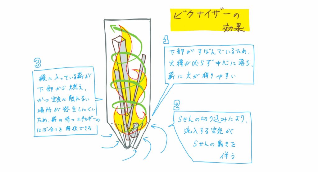 また、ビクナイザーはロケットストーブの燃焼筒に比べれば格段に短いため、薪の輻射熱がより多く鍋底に届きます。