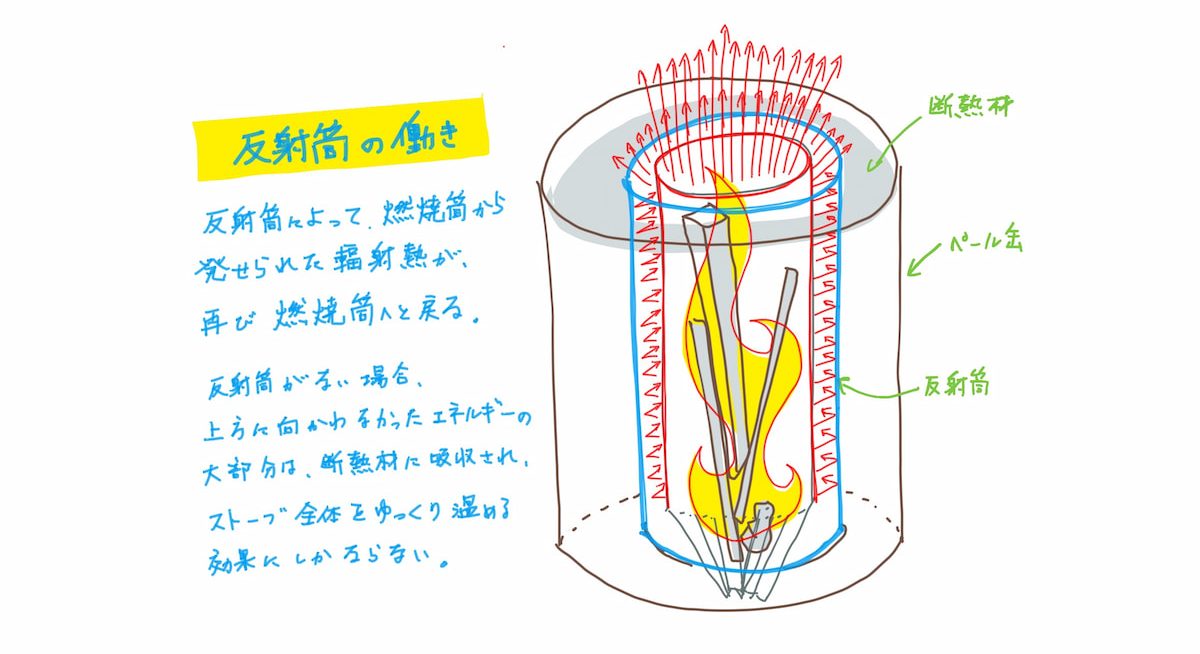 反射筒(講座では120mmステン煙突)があることによって、ビクナイザー外面から発せられた輻射熱が反射し、再度ビクナイザーへと戻ります。