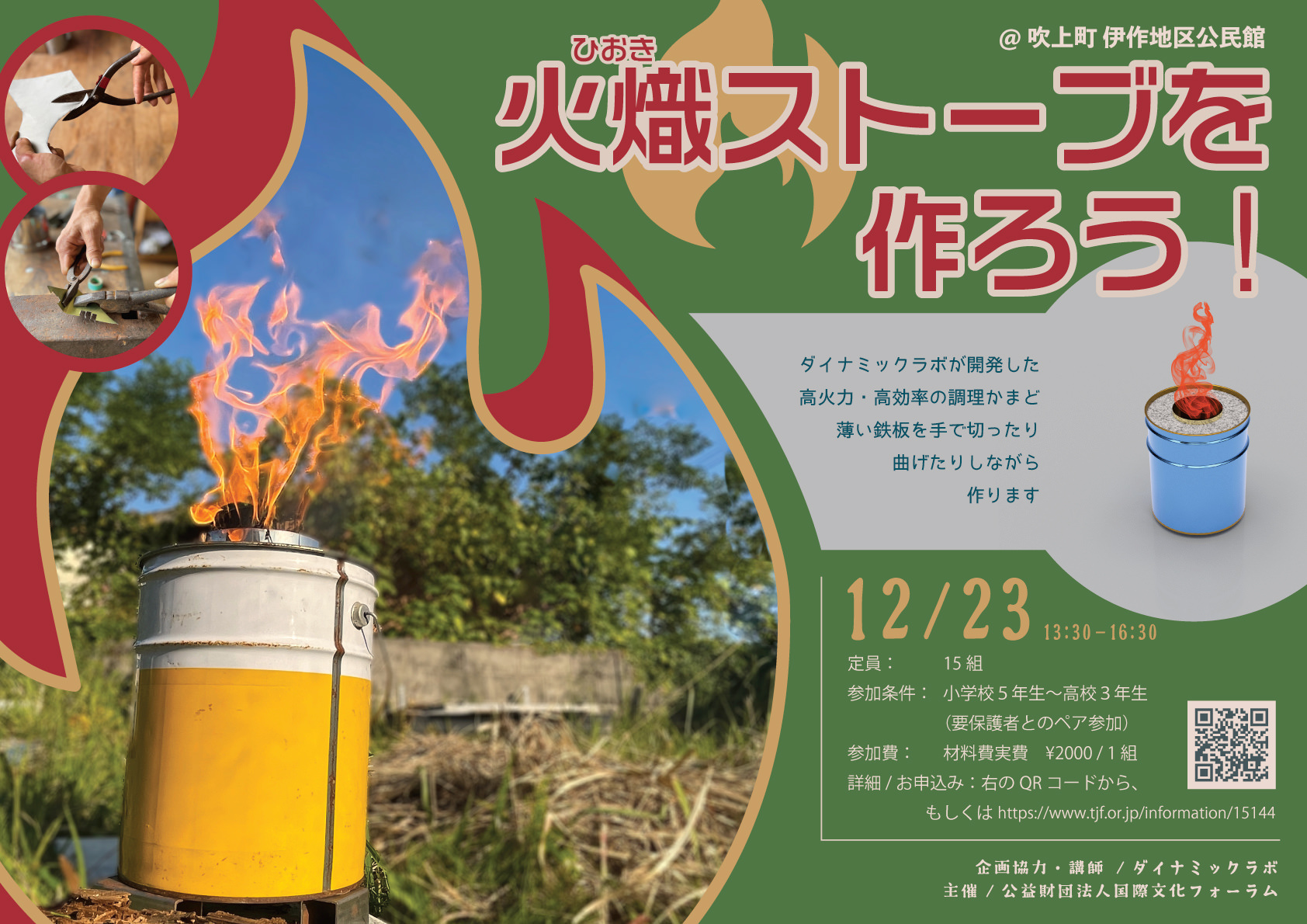 なお、ワークショップ実施中および終了後の事故、トラブル(ワークショップ終了後にご自身で火熾ストーブを使用したり制作したりする場合を含む)について、TJFおよび講師は一切の責任を負いません。