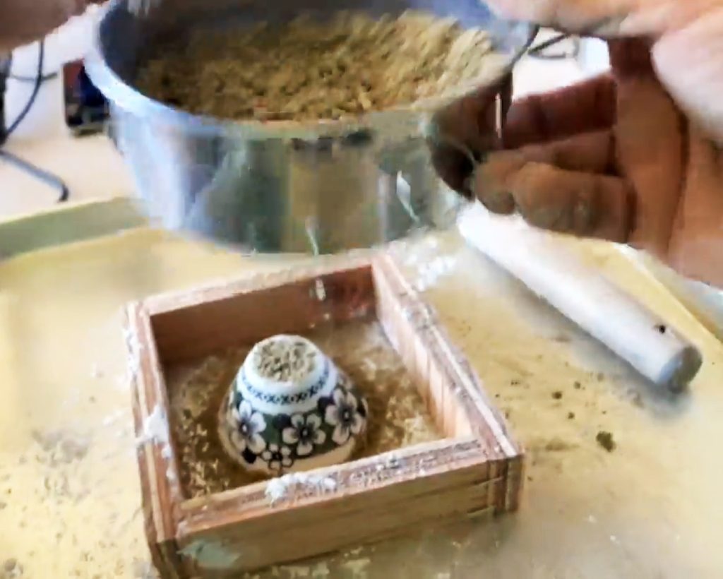 鋳造回当日は、100円ショップで売っているお猪口を「原型」として、それを砂に埋めて「砂型」を取り、砂型を組み立て溶かした錫を流し込み、錫のお猪口を作った。