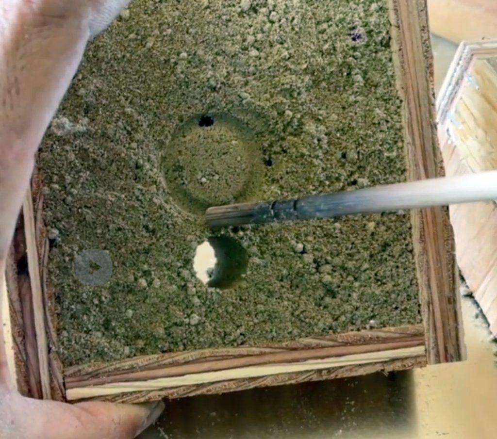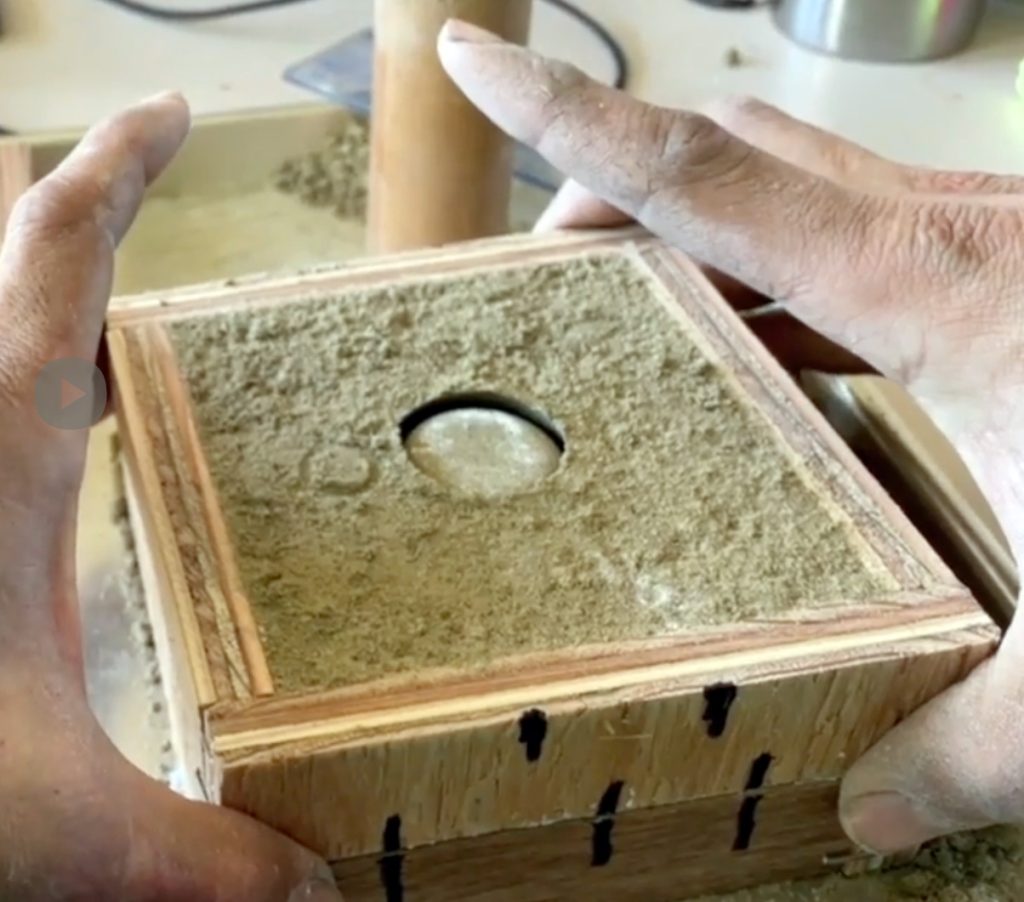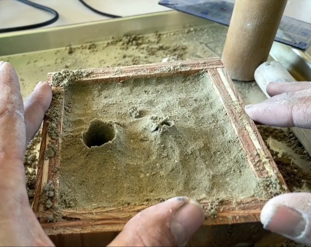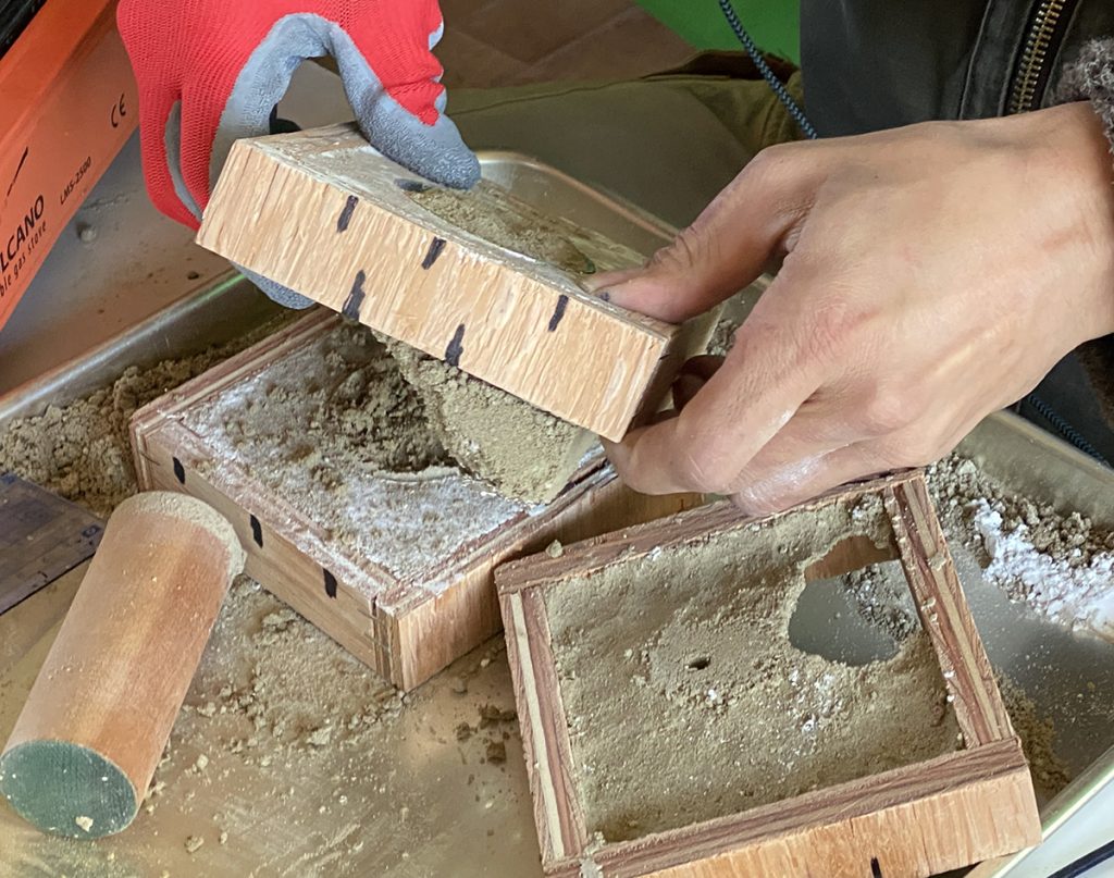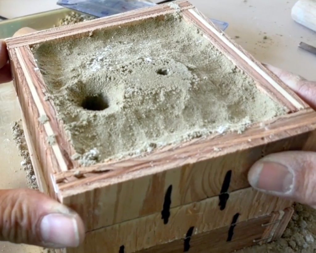1) 3つの木枠のうち、2段を重ね、原型を置いて合成砂(鋳砂でもいい)を入れて押し固める