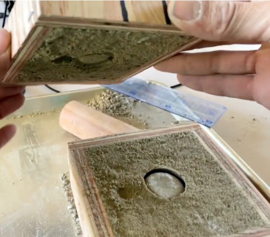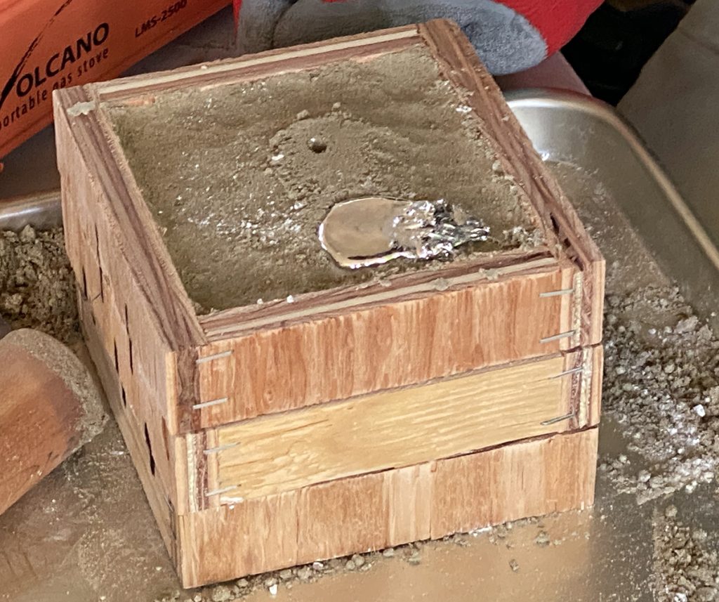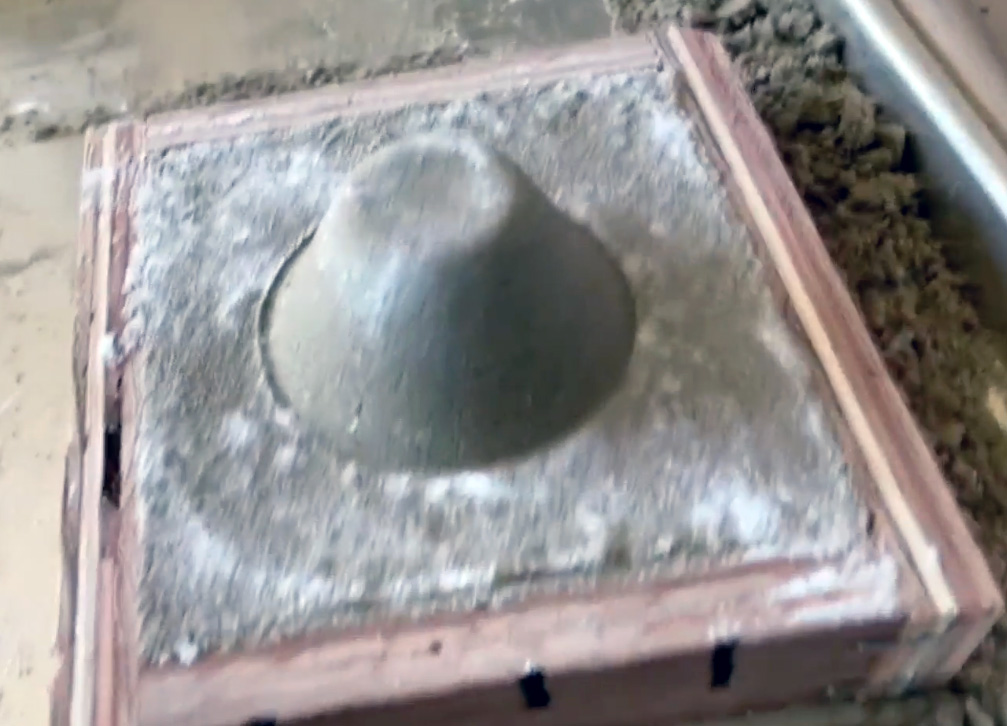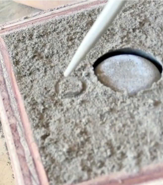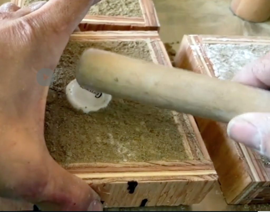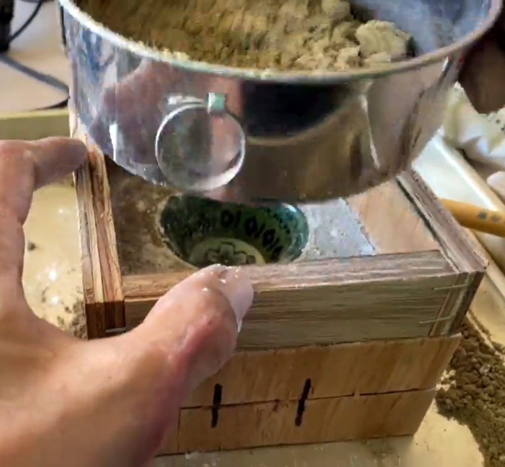 1) 3つの木枠のうち、2段を重ね、原型を置いて合成砂(鋳砂でもいい)を入れて押し固める
