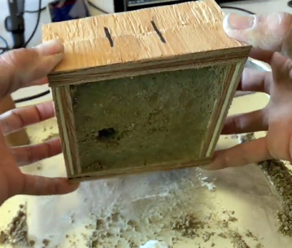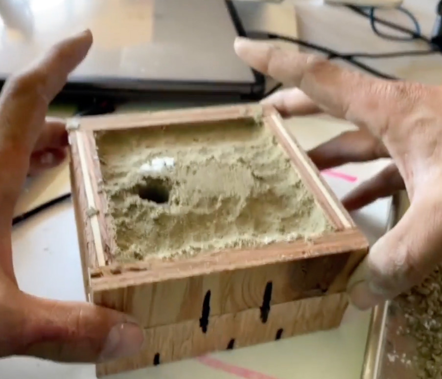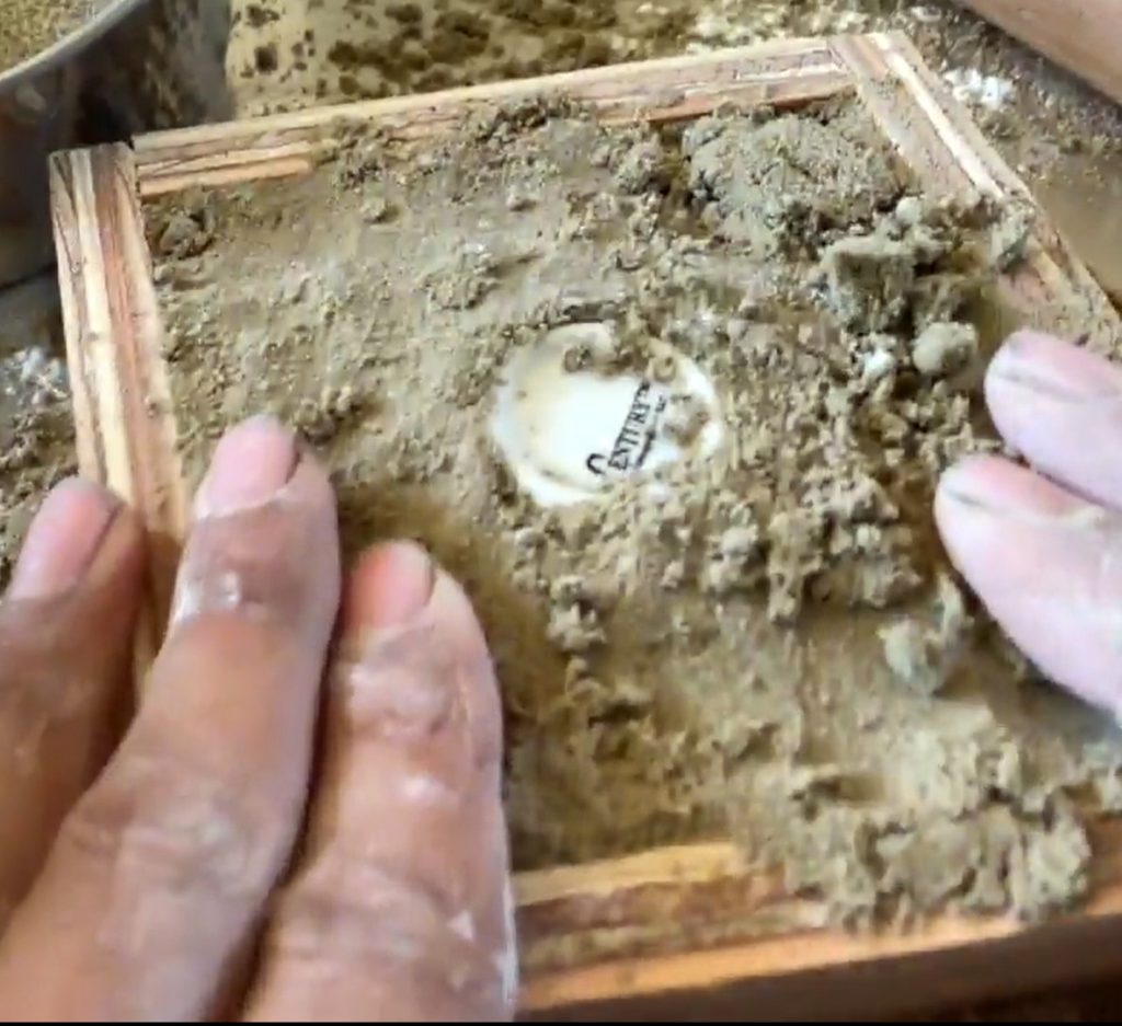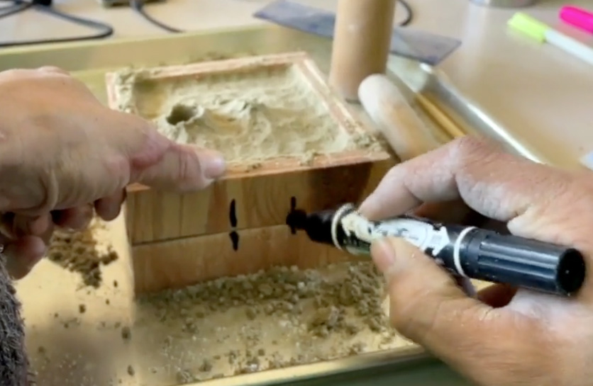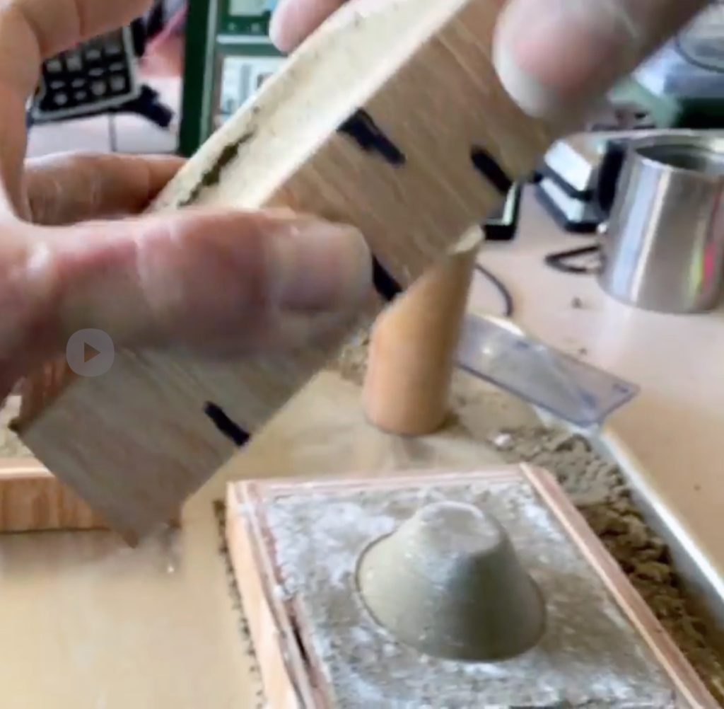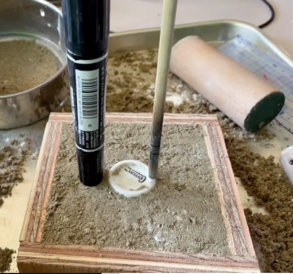 1) 3つの木枠のうち、2段を重ね、原型を置いて合成砂(鋳砂でもいい)を入れて押し固める