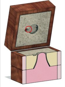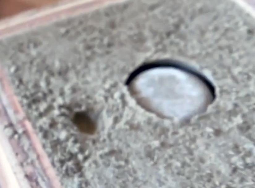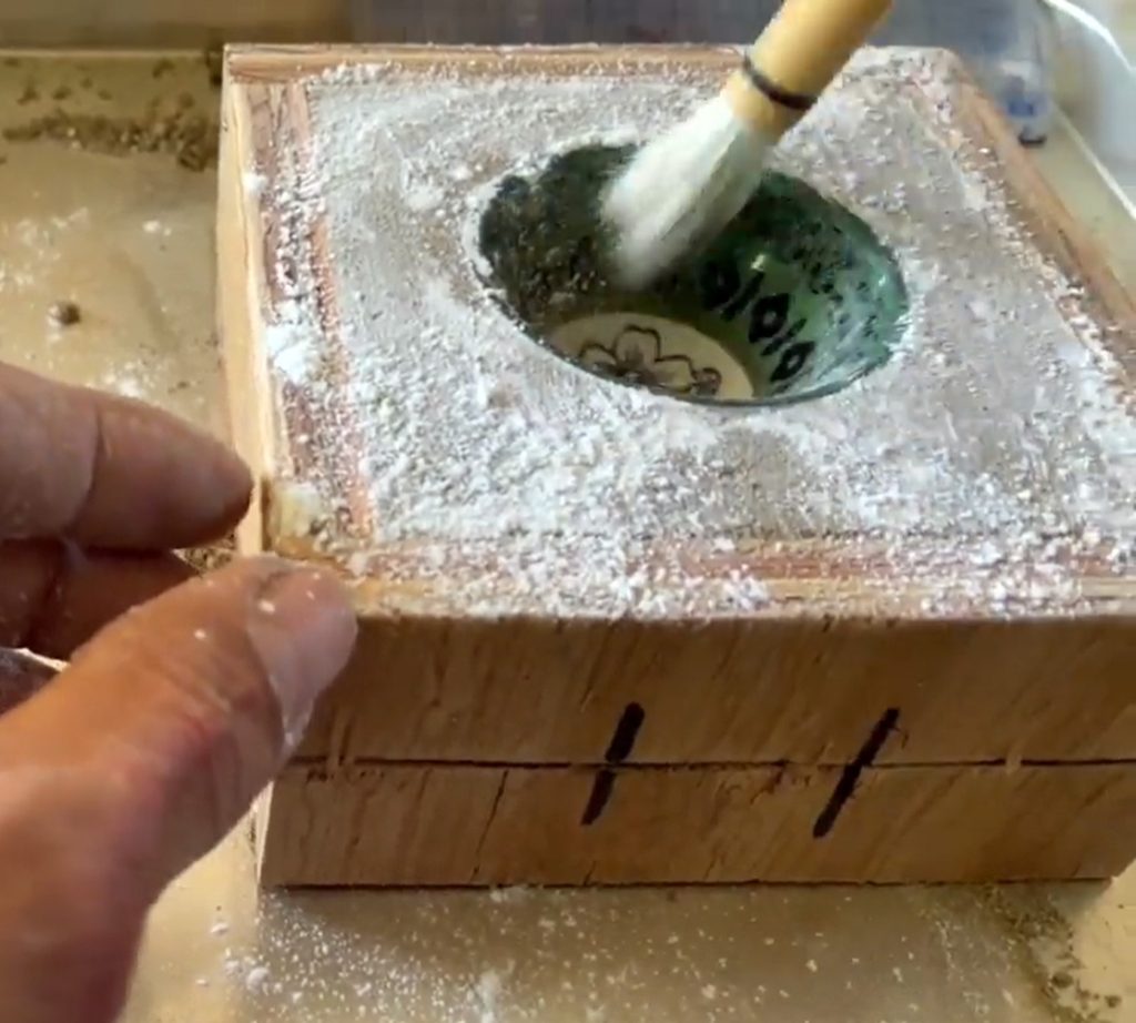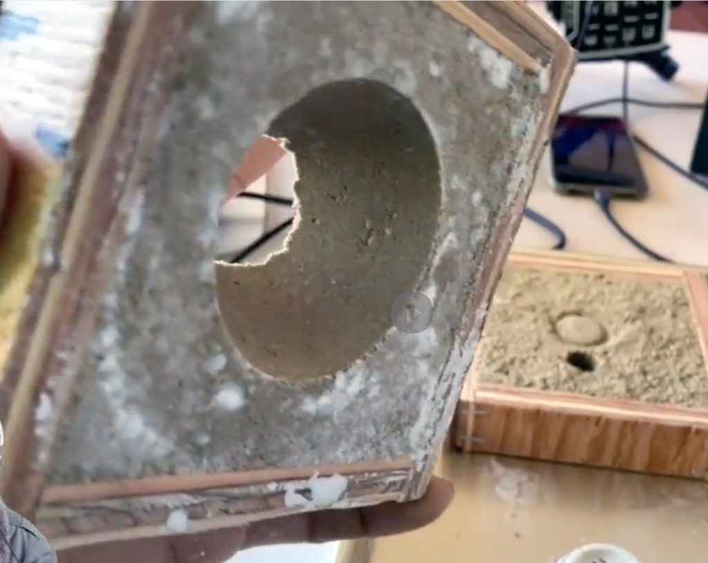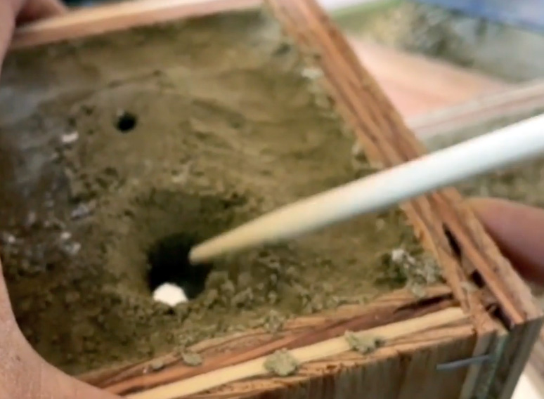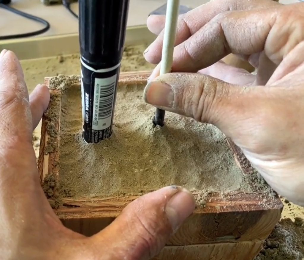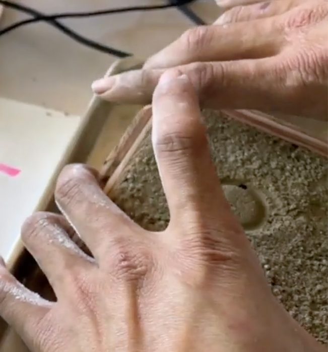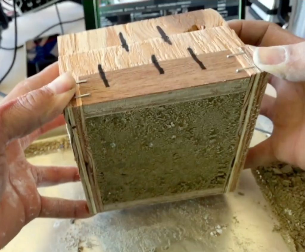 1) 3つの木枠のうち、2段を重ね、原型を置いて合成砂(鋳砂でもいい)を入れて押し固める