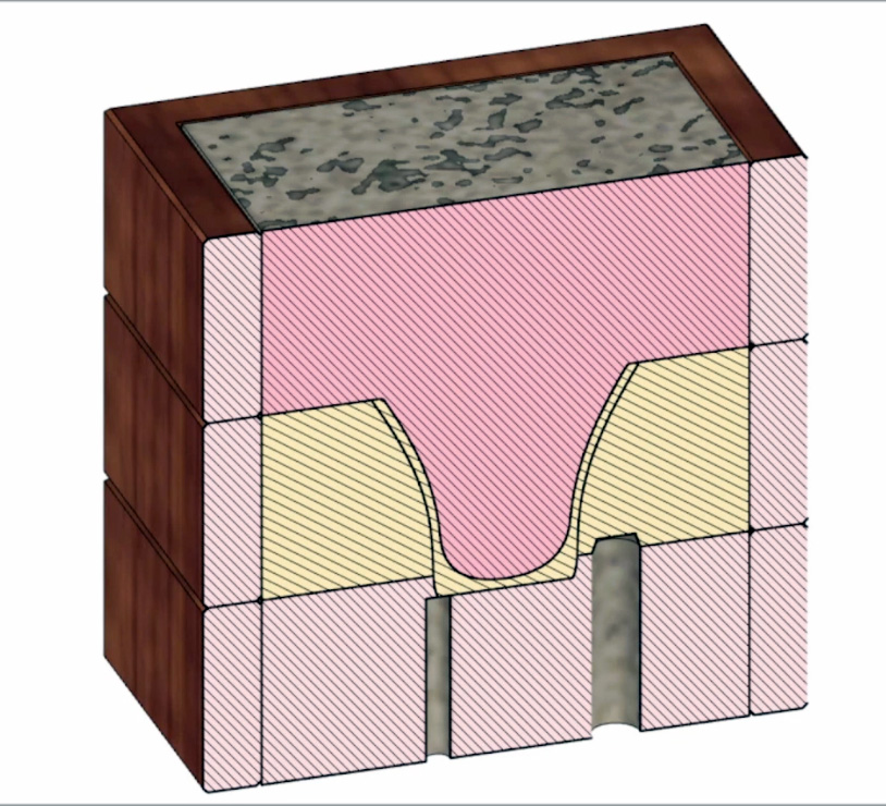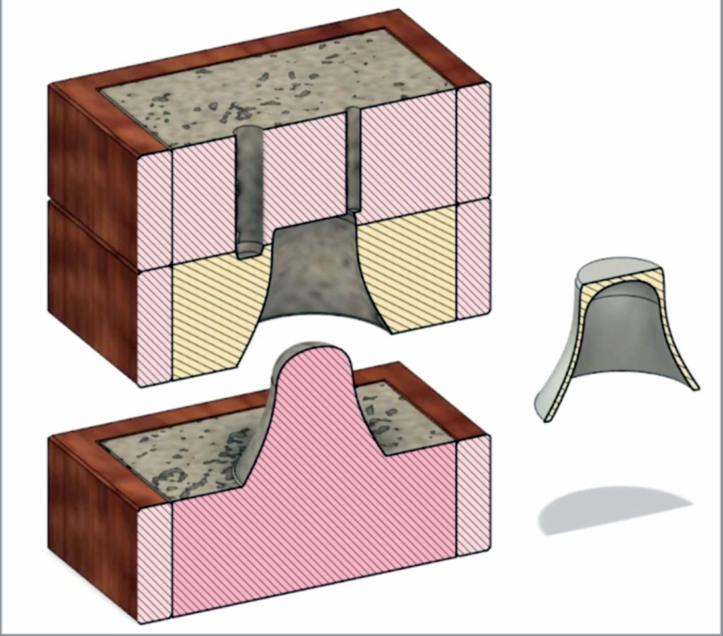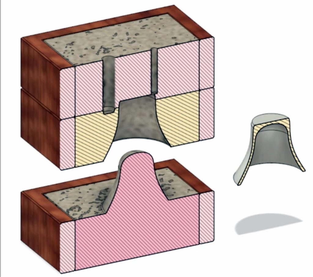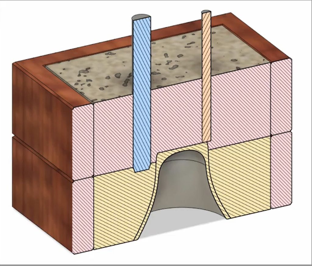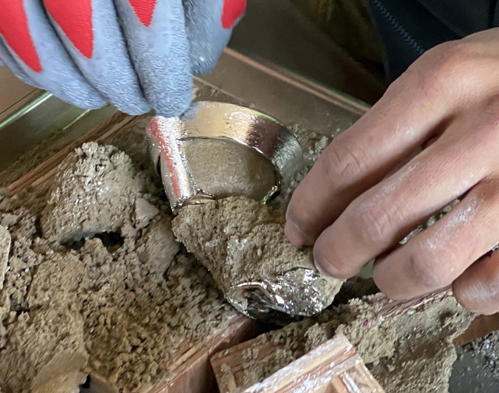 仮に最初に掘った穴がたとえば真上から見たらハートの形で、トンネルに流した水が溶けたチョコレートだったら、流し込みの後は、固まったハート型のチョコレートが得られるはず。鋳造はこれを金属を溶かしてやるだけの話だ。