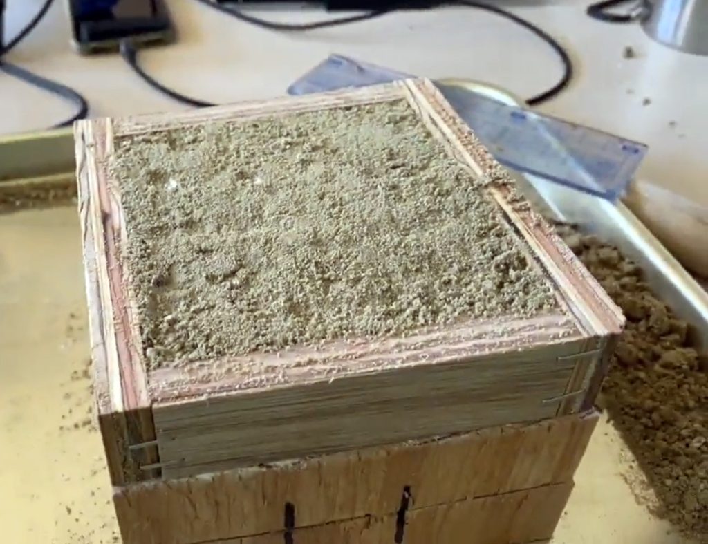 4) 3段目の木枠を重ね、砂を入れて押し固める