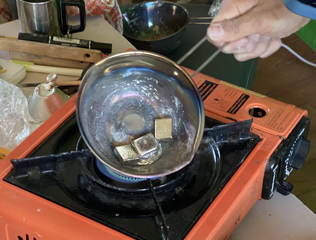 - カセットコンロで錫(事前送付)を溶かし、鋳造をする