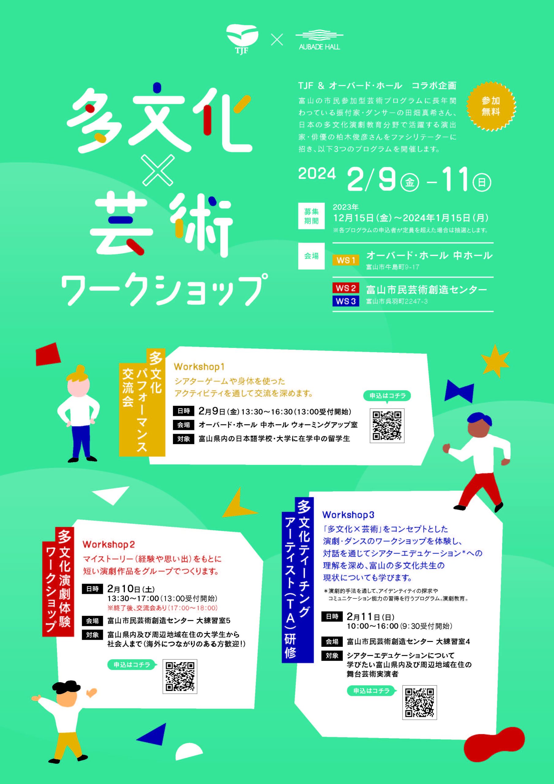 2024年は新たにオーバード・ホール(公益財団法人富山市民文化事業団)とコラボすることになりました。最初の企画として、2024年2月9日(金)~11(日)の日程で3つの連続ワークショップを開催します。長年PCAMPの企画・実施に尽力し、富山の市民参加型芸術プログラムにも関わって来られた振付家・ダンサーの田畑真希さん、日本の多文化演劇教育分野で活躍する演出家・俳優の柏木俊彦さんをファシリテーターにお招きするほか、3日めのワークショップ(WS3)では、現地講師の宮田妙子さんによる富山県の多文化共生についてのレクチャーも予定しています。各ワークショップともに地域の皆さまからのご応募をお待ちしております。