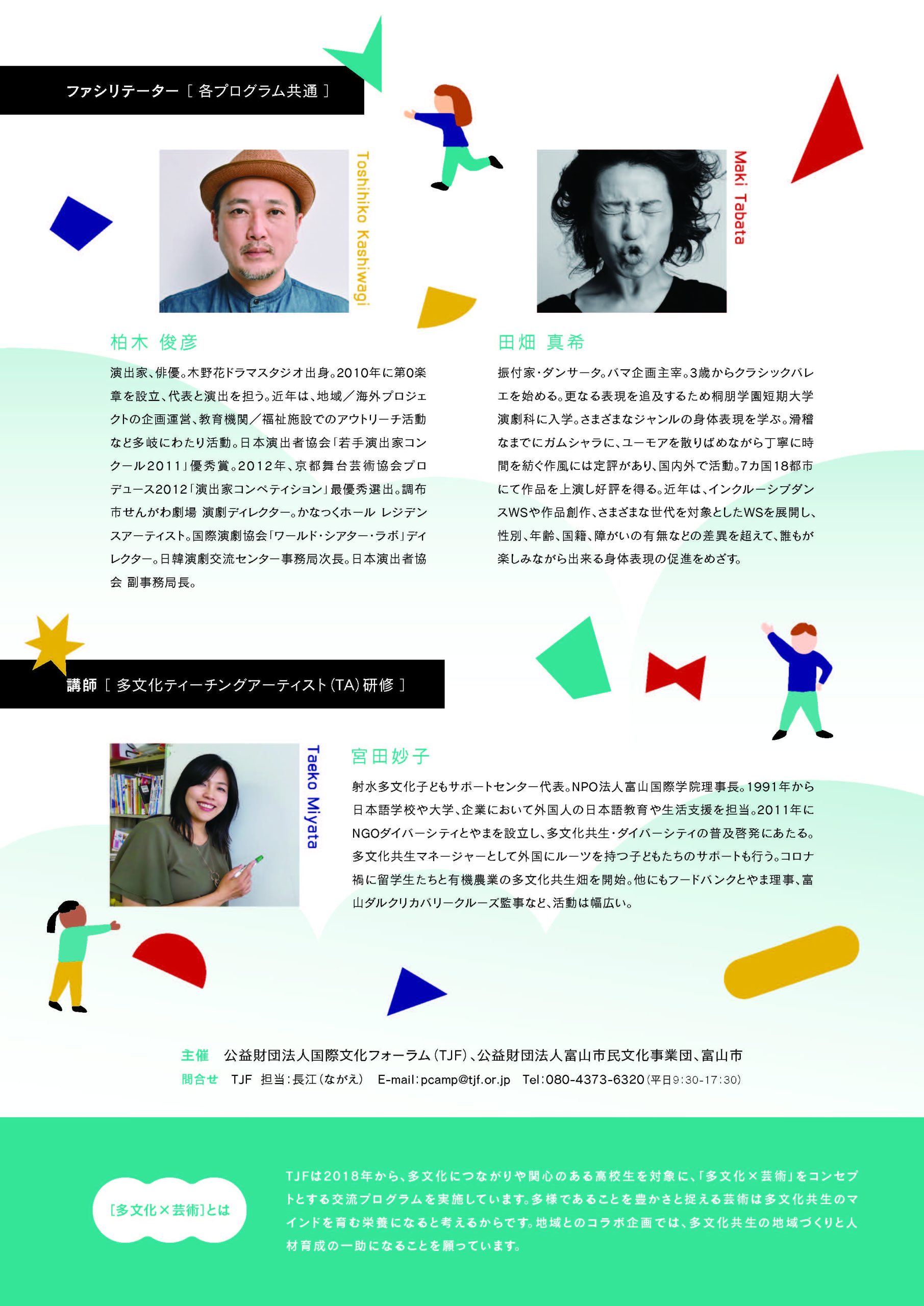 ●内容:「多文化×芸術」をコンセプトとした演劇・ダンスのワークショップを体験し、対話を通じてシアターエデュケーション(注)への理解を深め、富山の多文化共生の現状についても学びます。