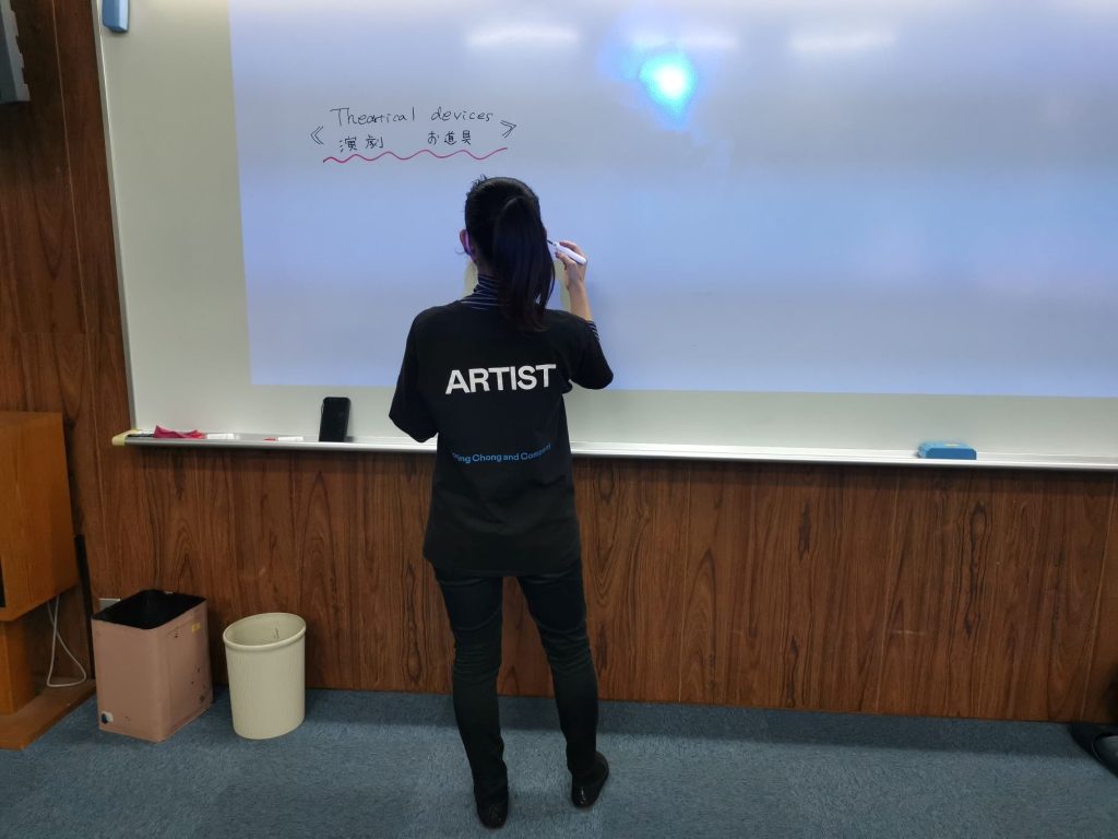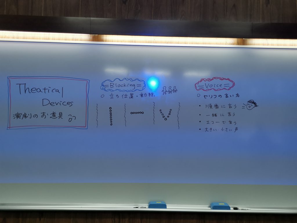ファシリテーターは、シアターゲームで体験したアクティビティから使うピースを選び、それに立ち位置やセリフ回しのアレンジを加え、入り方とはけ方を決めて、小さな作品をつくっていく方法を文字とデモンストレーションを通して説明しました。