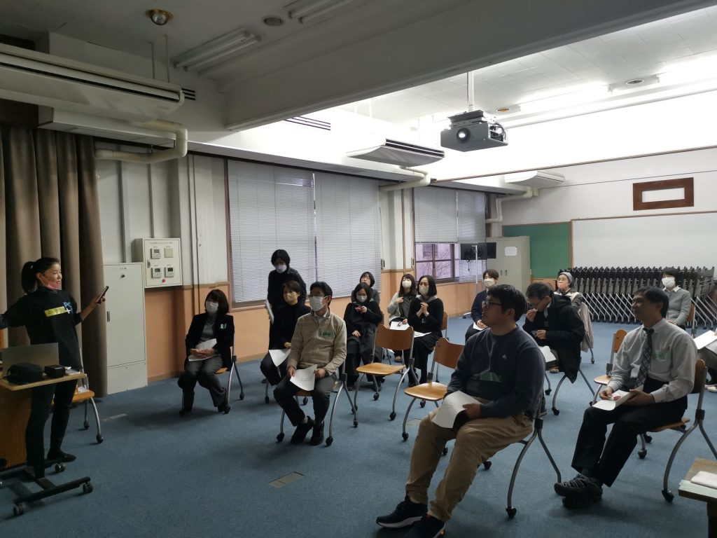 ワークショップ当日は終業式や関連行事もあって、教員の皆さんは多忙なスケジュールをこなしたあと、会場となる視聴覚室に集合。当初は10名程度の参加予定でしたが、最終的には17名が集まり、皆さんの関心度の高さがうかがえました。
