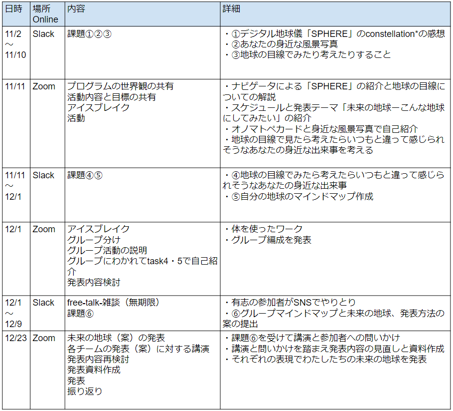そこで、日数、期間を拡大して、参加者間はもちろん講師・ナビゲーターと参加者の間の対話環境を整えることで、地球を文脈にしたつながりの実現を目指すプログラムを企画しました。