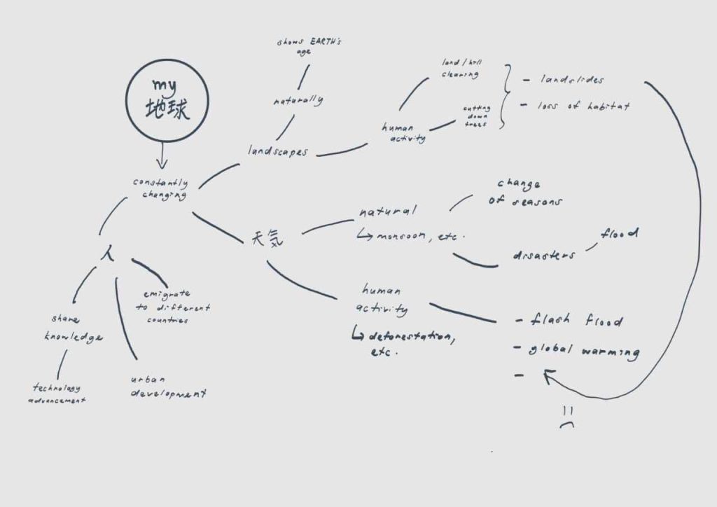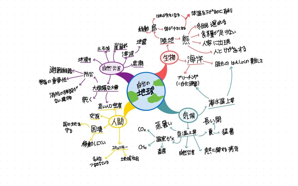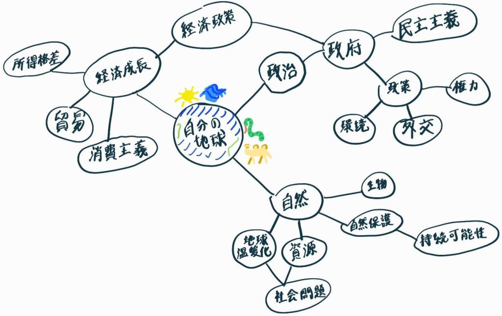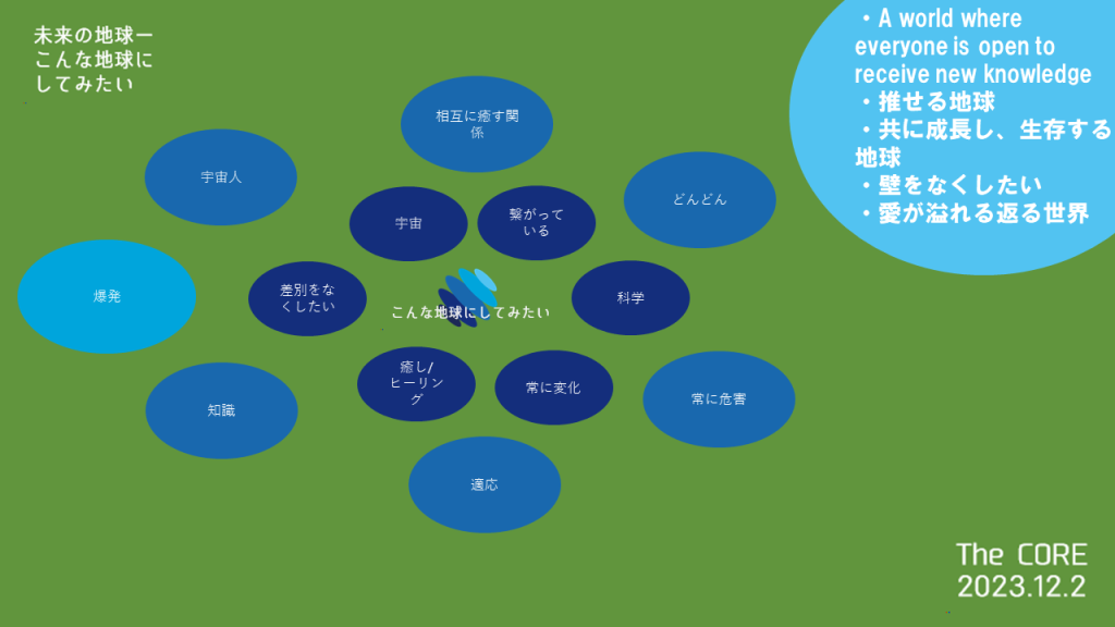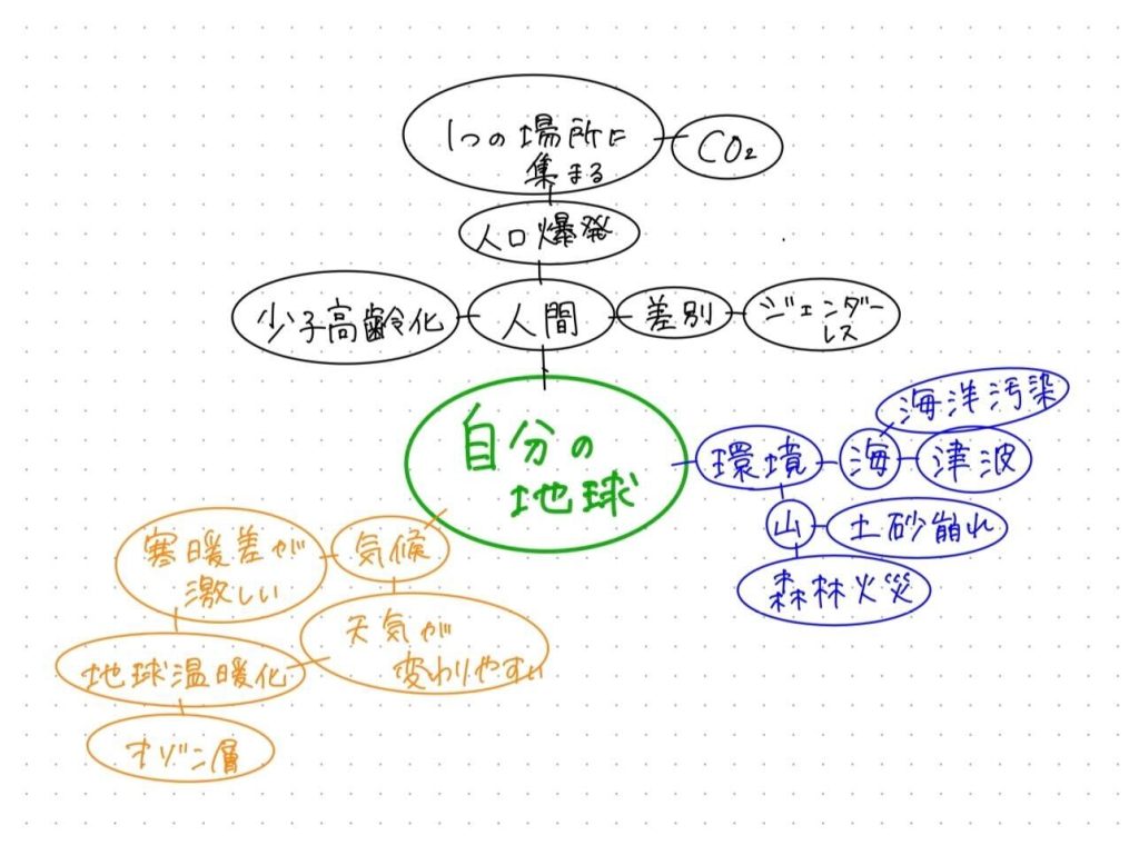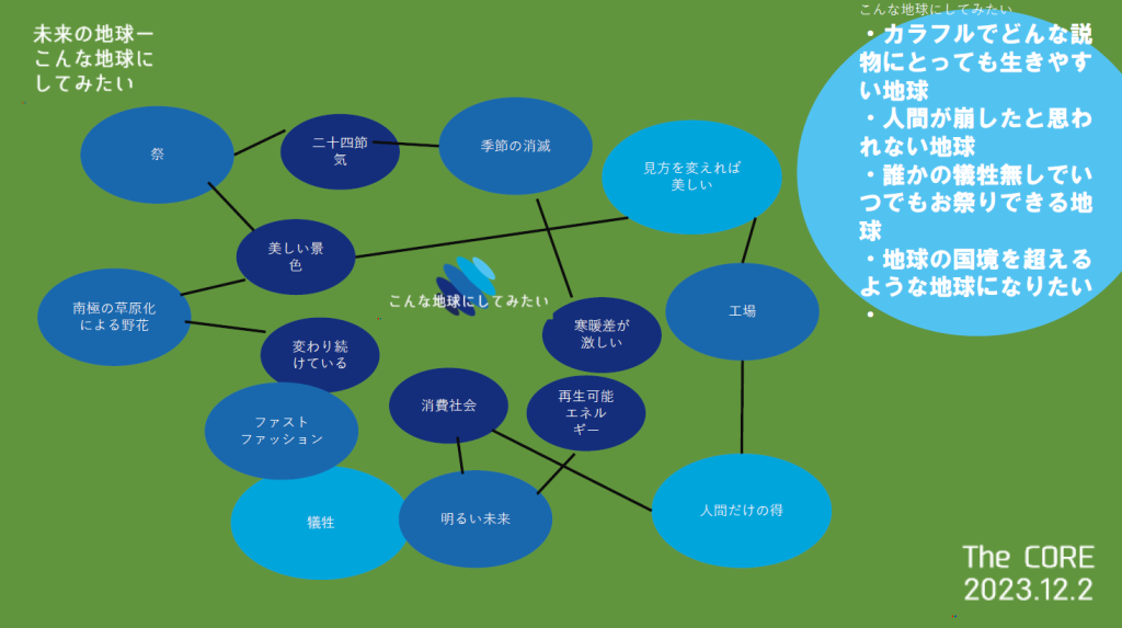 グループに分かれてからは、それぞれが課題4「地球の目線でみたら考えたら、いつもと違って感じられそうなあなたの身近な出来事」と課題5の「自分の地球のマインドマップ」を自己紹介としてシェアしました。