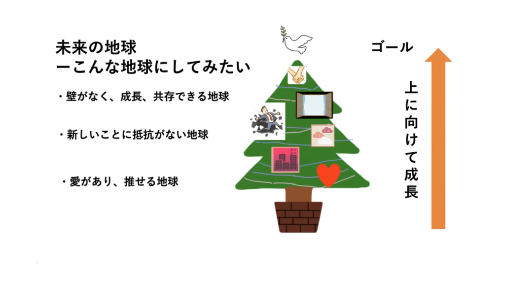 宇宙船地球号2は、下から順に「愛があり、推せる地球」「新しいことに抵抗がない地球」「壁がなく、成長、共存できる地球」、そして先端に「平和」というキーワードをクリスマスツリーの飾りにみたてたイラストをあしらい、成長する地球を表現しました。