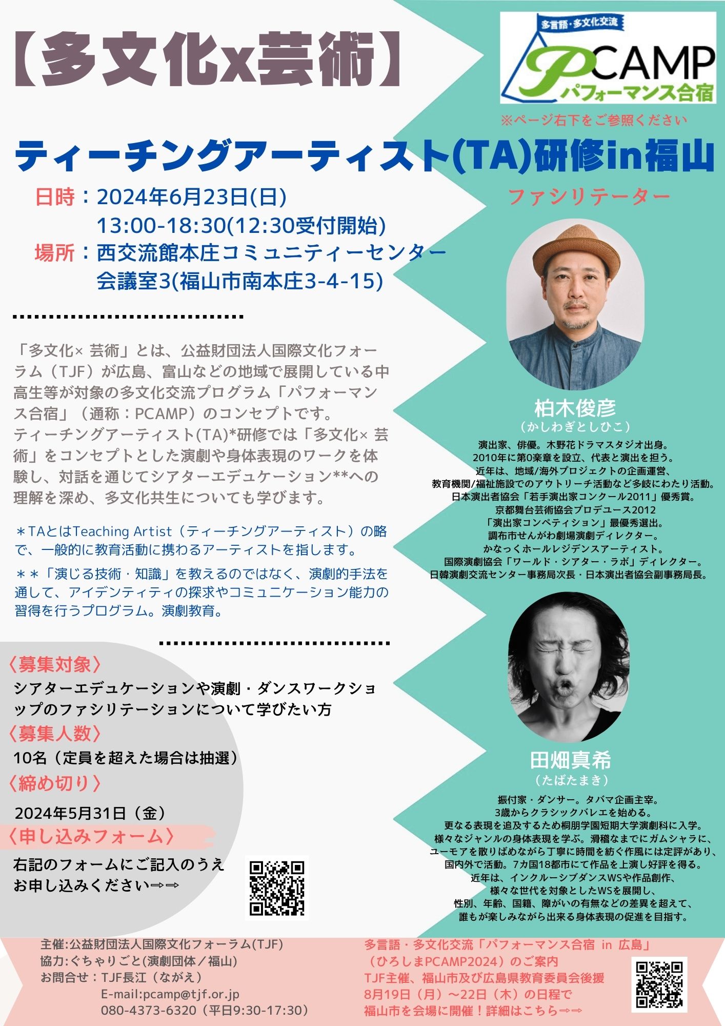 TJFは2024年6月23(日)、広島県福山市を会場に「ティーチングアーティスト(TA)研修を実施します。実施概要中のフォームからお申し込みください。5月31日(金)締切り。