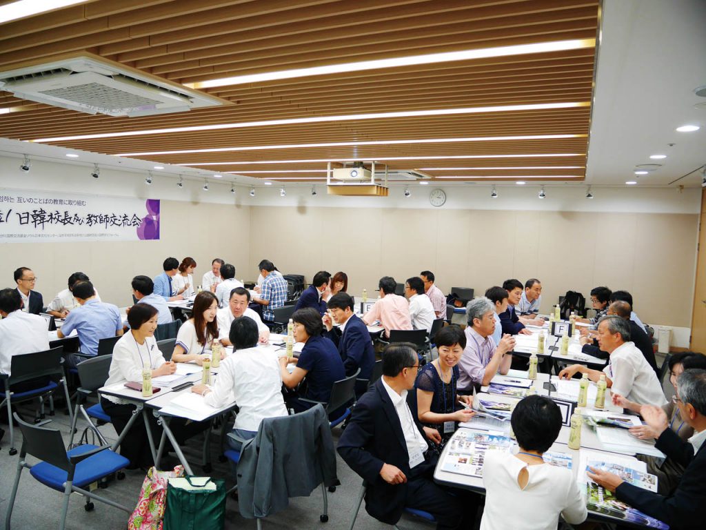 日韓で互いのことばの教育や学校間交流を促進するとき、その鍵を握っているのは管理職であることから、2015年度に日韓校長交流プログラムを始めました。2016年度は、東京、神奈川、千葉、埼玉、広島の高校から校長など11名を8月に3泊4日で韓国に派遣しました。ソウルで実施した日韓校長交流会に、韓国側は日本語教育を実施している中学・高校の校長、日本語教師計19名が参加し、互いの教育に対する考え方などを話しながら、日韓の学校が交流する意義やその可能性について意見交換しました。