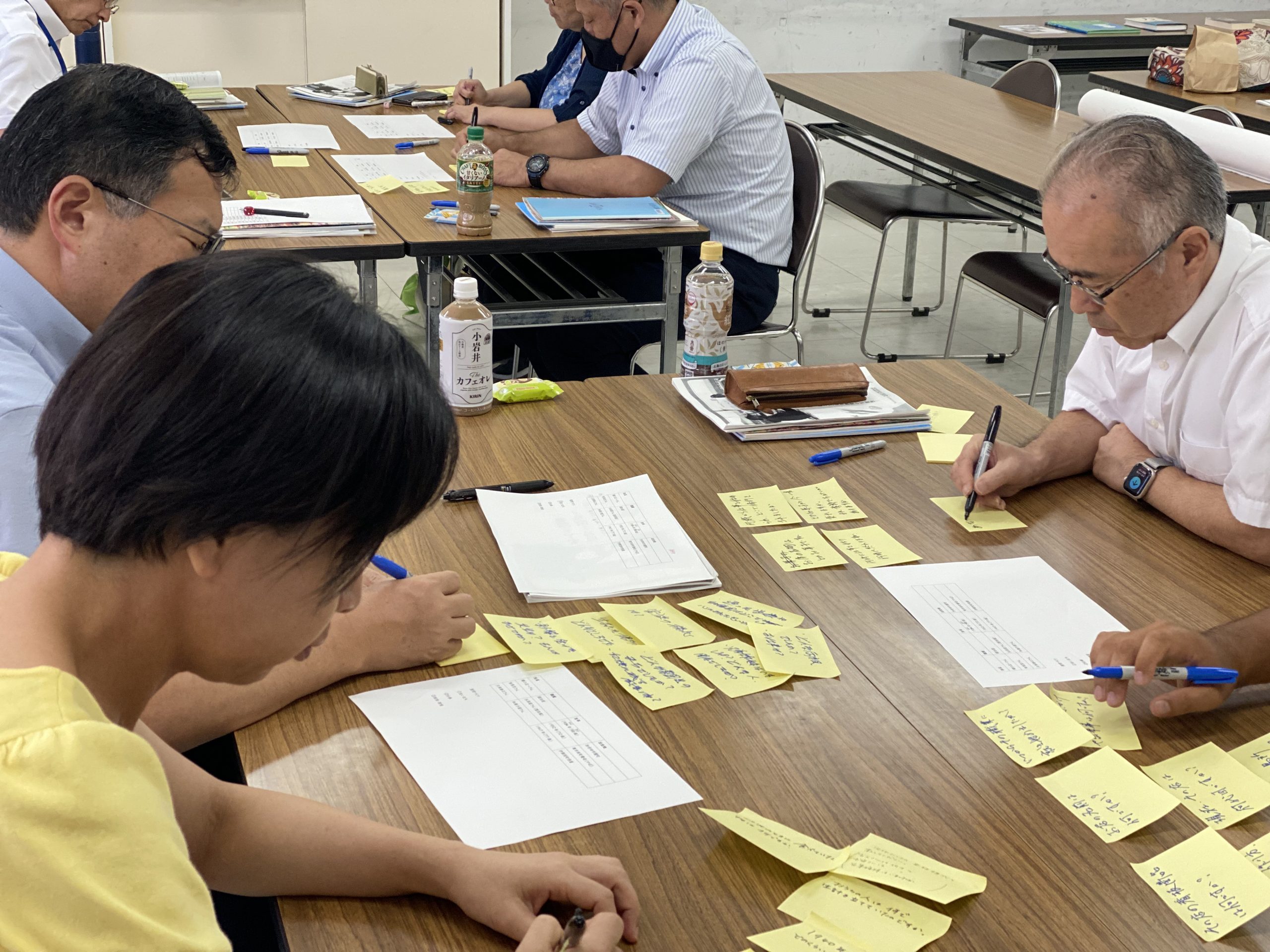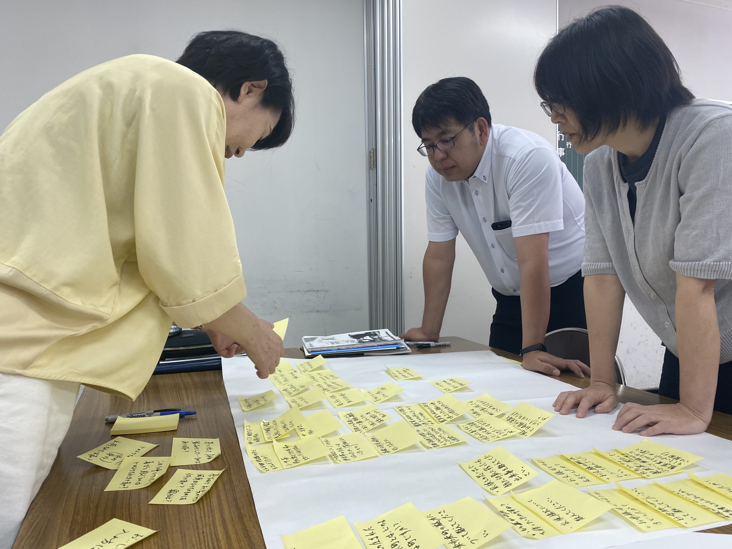 「絵描きさんは筆で描く、彫刻家は粘土で塑像をつくる、聞き書き作家は何をするかというと、質問で人物を描く。質問を上手に作れれば、答えが山ほど返ってくる」と塩野さんが語るように、質問は「聞き書き」の基本です。各グループにはこちらで考えた架空の人物の情報を渡しました。用意した情報は、氏名、年齢、職業、住んでいる町のみ。これらを頼りに、グループ内で、①生い立ち、②仕事、③家族・環境について質問をつくる担当を決め、各自でポストイットに思いつくまま質問を付箋紙に書き出したあとは、グループで質問を整理し、質問する順番を考えて模造紙に付箋紙を貼ってもらいました。どのグループも模造紙に貼り切れないほどの質問を整理するために白熱した意見交換が見られました。