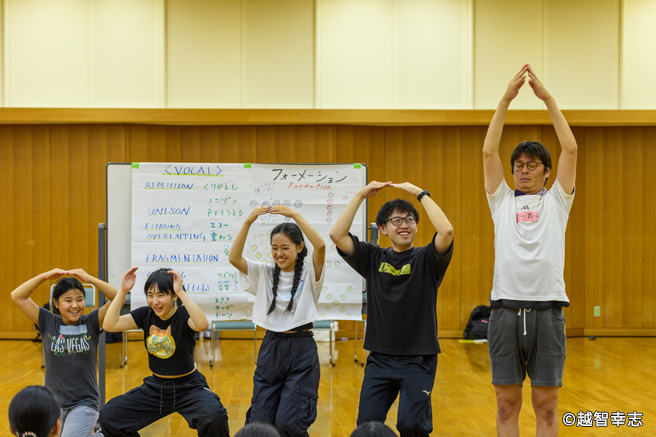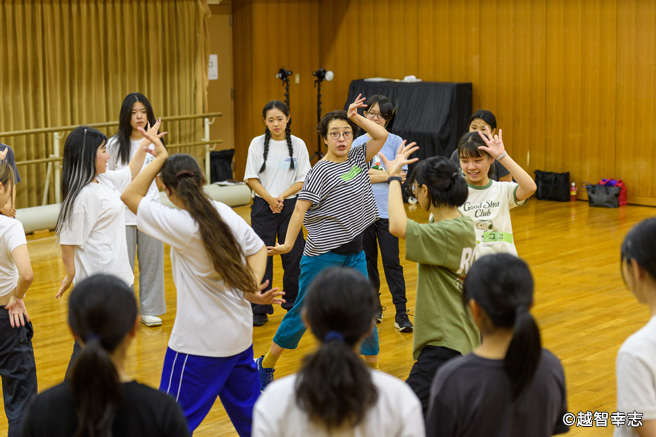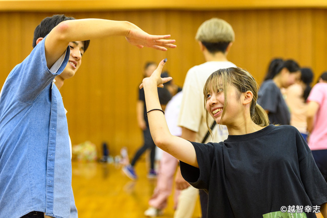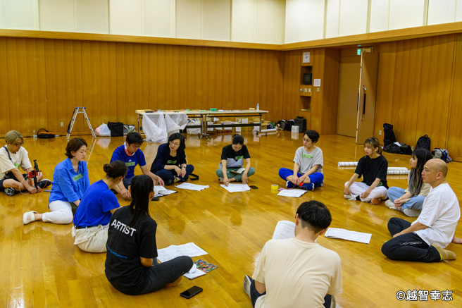 また、今回は海外ゲスト枠として韓国の高校で日本語を学ぶ生徒2名を招待し、合計22名の中高生年代が3泊4日の合宿生活を共に送り、交流、創作活動、発表会を行いました。参加者に伴走するのは、「ひろしまPCAMP」の第1回から関わっているファシリテーター5名(メイン3名、サブ2名)です。ふだんはそれぞれニューヨーク、東京、広島を拠点に活躍しているアーティストから成るファシリテーターチームとスタッフチームが運営を担い、参加者22名のパフォーマンス作品創りと最終日の発表会に伴走しました。