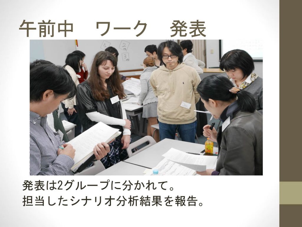 この研修では、多言語混成チームで作業を行った。これは「そのほうがおもしろいと思ったから」である。この思いつきの成果ははるかに予想を超えた。誰も共同作業中に言語の違いを理由に「No」と言ったりなどしなかった。それどころか、研修が終わっても、教える言語の違いを超えた共同作業を続けているグループがある。また、有志で団体を組織し、外国語教育に関わる活発な活動を展開していたりもする。「コミュニケーションの目的は新たな人的ネットワークを作ること」を標榜する「めやす」の研修で、このようなつながりができるのは当たり前なのかもしれないが、何だかとても嬉しい。