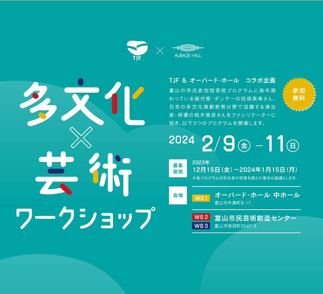 TJFは2024年、「とやまPCAMP」の立ち上げに先立ち、「多文化×芸術」をコンセプトに、2月9日~11日の日程で、富山市民文化事業団、富山市との共同主催による三つのワークショップ(WS)を開催しました。