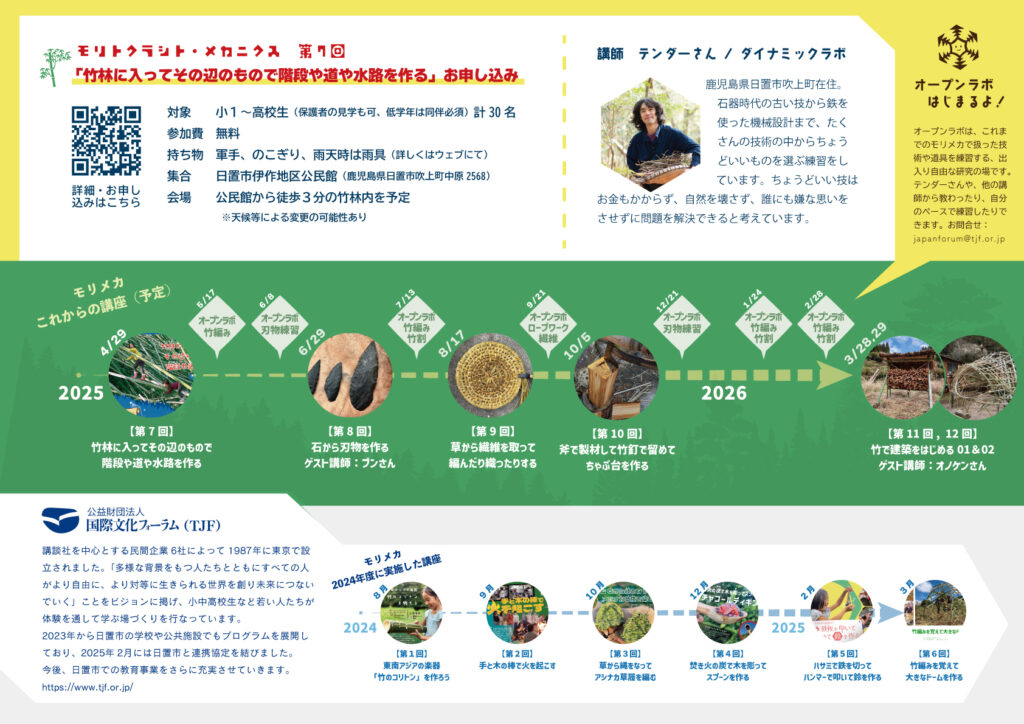 モリトクラシト・メカニクスは、裏山や川で手に入る草木や竹や石などの自然素材を、工具を使って加工し、新たな「道具」を作ることで算数や数学、理科や物理といった教科の内容を楽しい体験として習得するプログラムです。この一連を通して、暮らしに必要なものを自ら作り出せるタフなお子さんへの成長をお手伝いします。