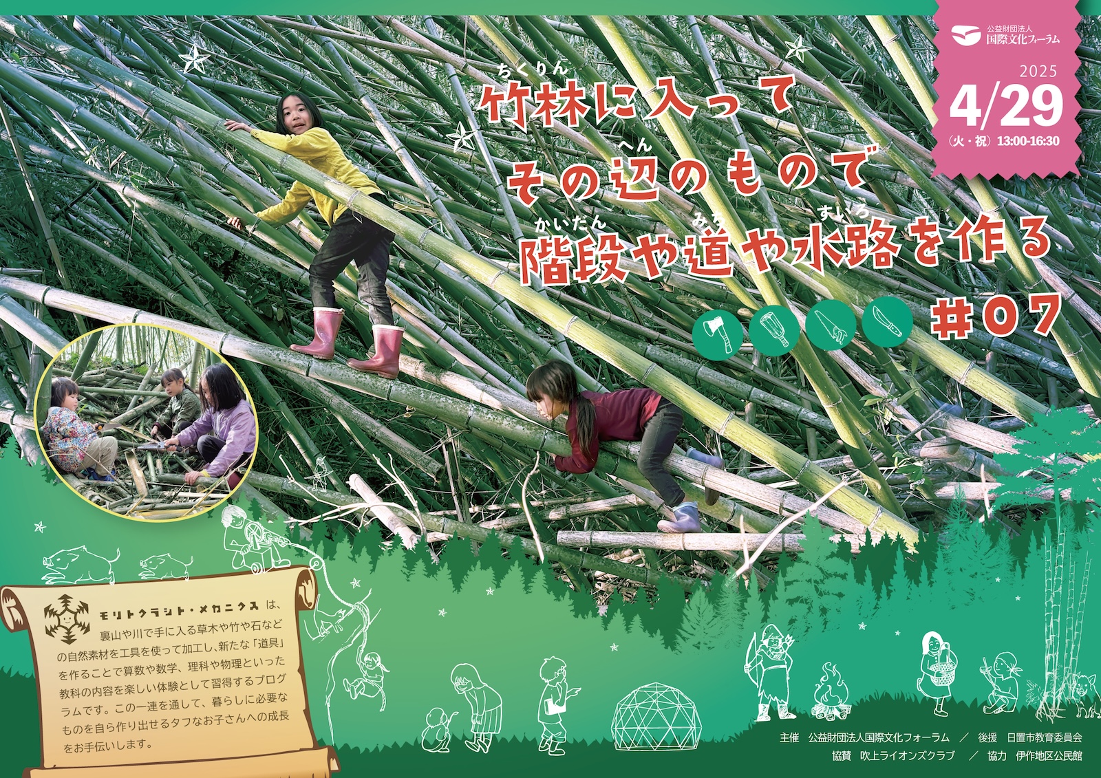 - 大きな機械を使わないで、落ちている枝や木や竹でできる土木作業を体験する。